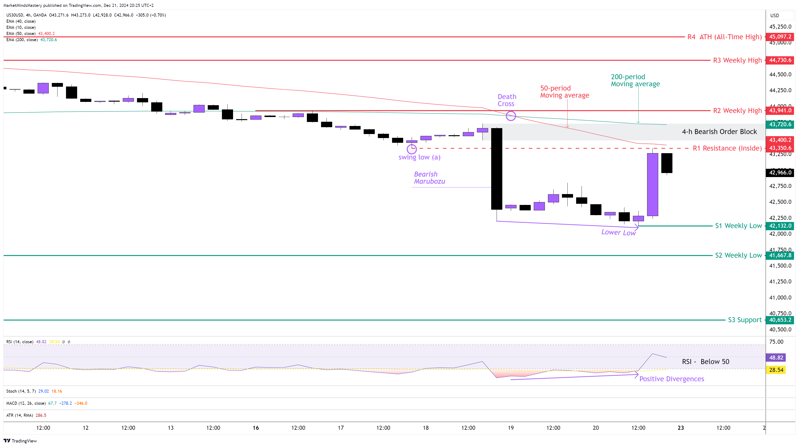 Following the previous week’s Market Outlook, the price of the US30 kept moving downwards, and the weekly chart ended with a Bearish candlestick for the third week in a row. On the 4-hour chart, the price created a Death Cross once the 50-period crossed below the 200-period moving average last Wednesday, after the FED’s FOMC Minutes. The candlestick that showed this is a Bearish Marubozu, which has bearish implications. The RSI Oscillator created a Positive (or Bullish) Divergence once the price registered a new lower low last Friday. The price then moved upwards, as the last low occurred under Low Volume. Last Friday, towards the end of the New York trading session, the price reached the swing low at point (a) and declined, as shown on the chart. Currently, the price is around $43000. Hence, if the price continues moving downwards, the first support area, S1, will be at $42132, which is the previous week’s low. If the price penetrates the S1 and keeps moving downwards, the next support area, S2, will be at $41667, which is an older weekly level. If the price penetrates the S2 and keeps lowering, the next support area, S3, will be around $40653.