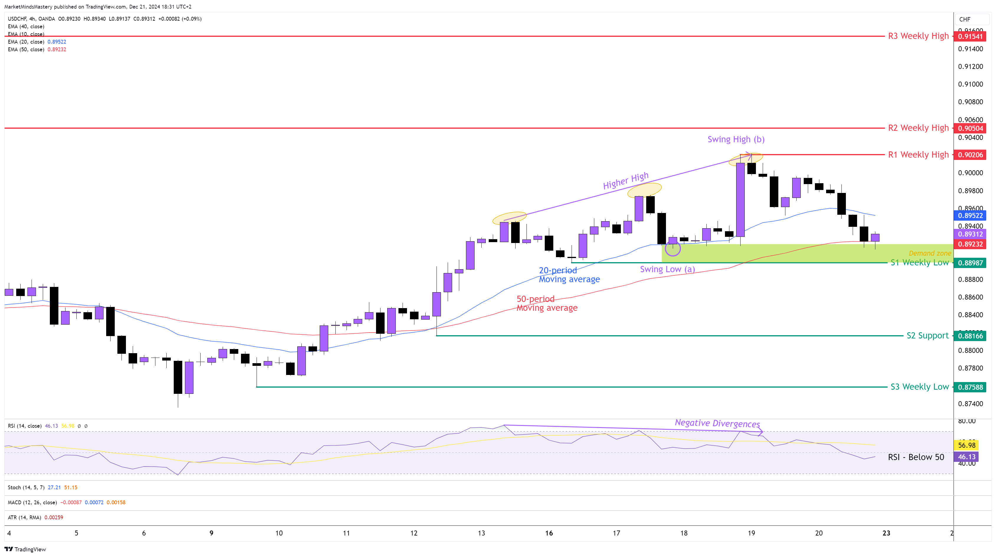 The price of the USDCHF on the weekly chart last week ended as a Bearish Reversal candlestick with a Long Upper Wick and a very small body size. This shows the price rejection as the USD was pressing for higher value, but by the end of the week, the price was rejected, and the candlestick left a noticeable upper wick. On the 4-hour chart, the 20-period is above the 50-period moving average, and this is bullish. The price still maintained its higher high and higher low formation but under the disagreement of the RSI, showing Negative (or Bearish) Divergences as shown on the chart. Currently, the RSI Oscillator is below its middle line of 50, and this has bearish implications.