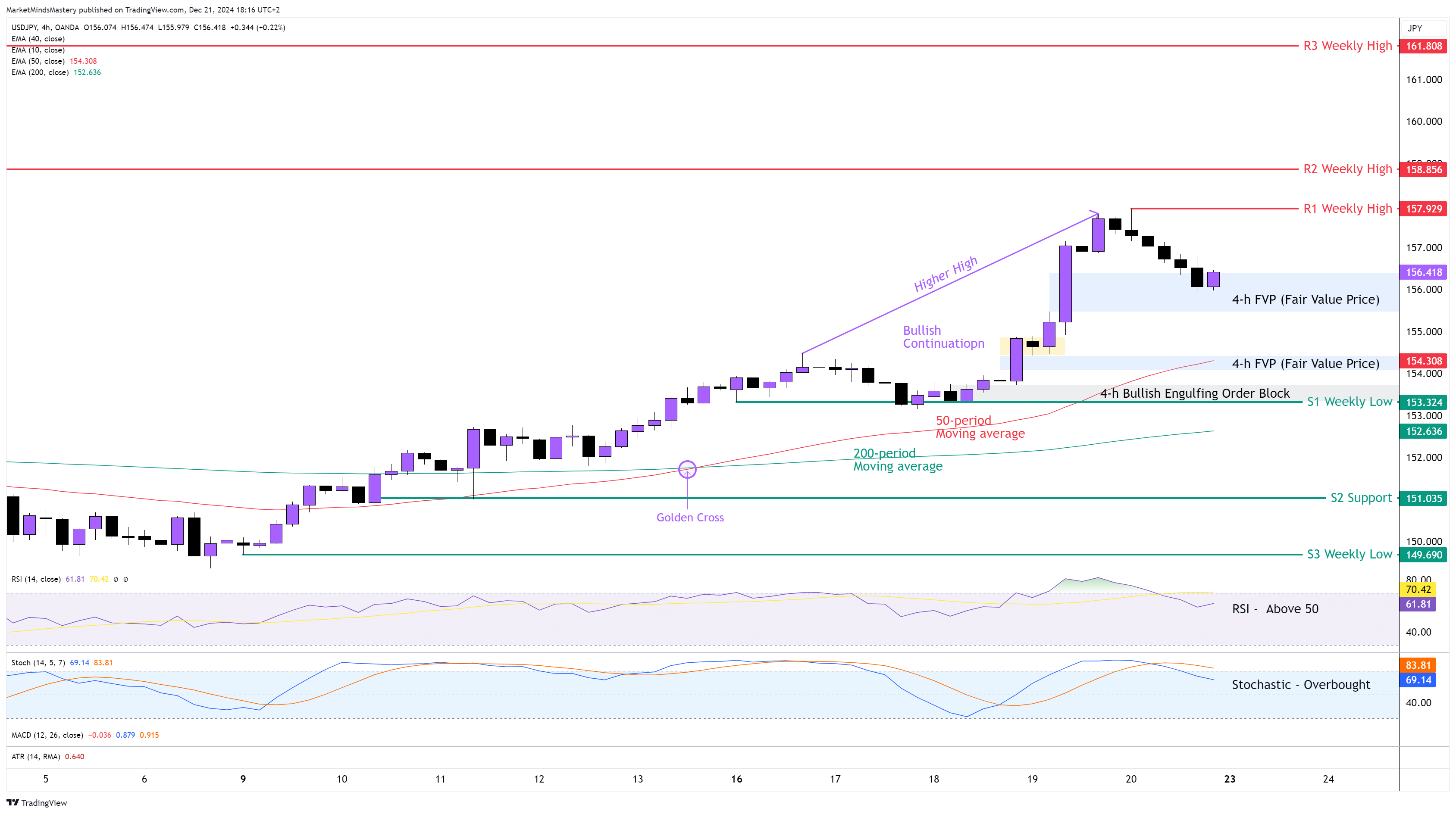 Last Wednesday, during the London trading session, the price created a Bullish Engulfing Order Block around 153.400, and during the New York trading session, an FVP (Fair Value Price) of around 154.000. Currently, the price is trading within the FVP created last Thursday at around 156.400. Hence, if the price keeps moving upwards, the first resistance area, R1, will be around 157.929, which is the previous week’s high. If the price penetrates R1 and keeps moving upwards, the next resistance area, R2, will be around 158.856. A further upward move will find the next resistance area, R3, around 161.808. Conversely, if the price rejects and starts moving downwards, the first support area, S1, will be at 153.324. This is a key level of support, as it coexists with the Bullish Engulfing Order Block, as shown on the chart. If the price penetrates the S1 and keeps lowering, the next support area, S2, will be around 151.035.