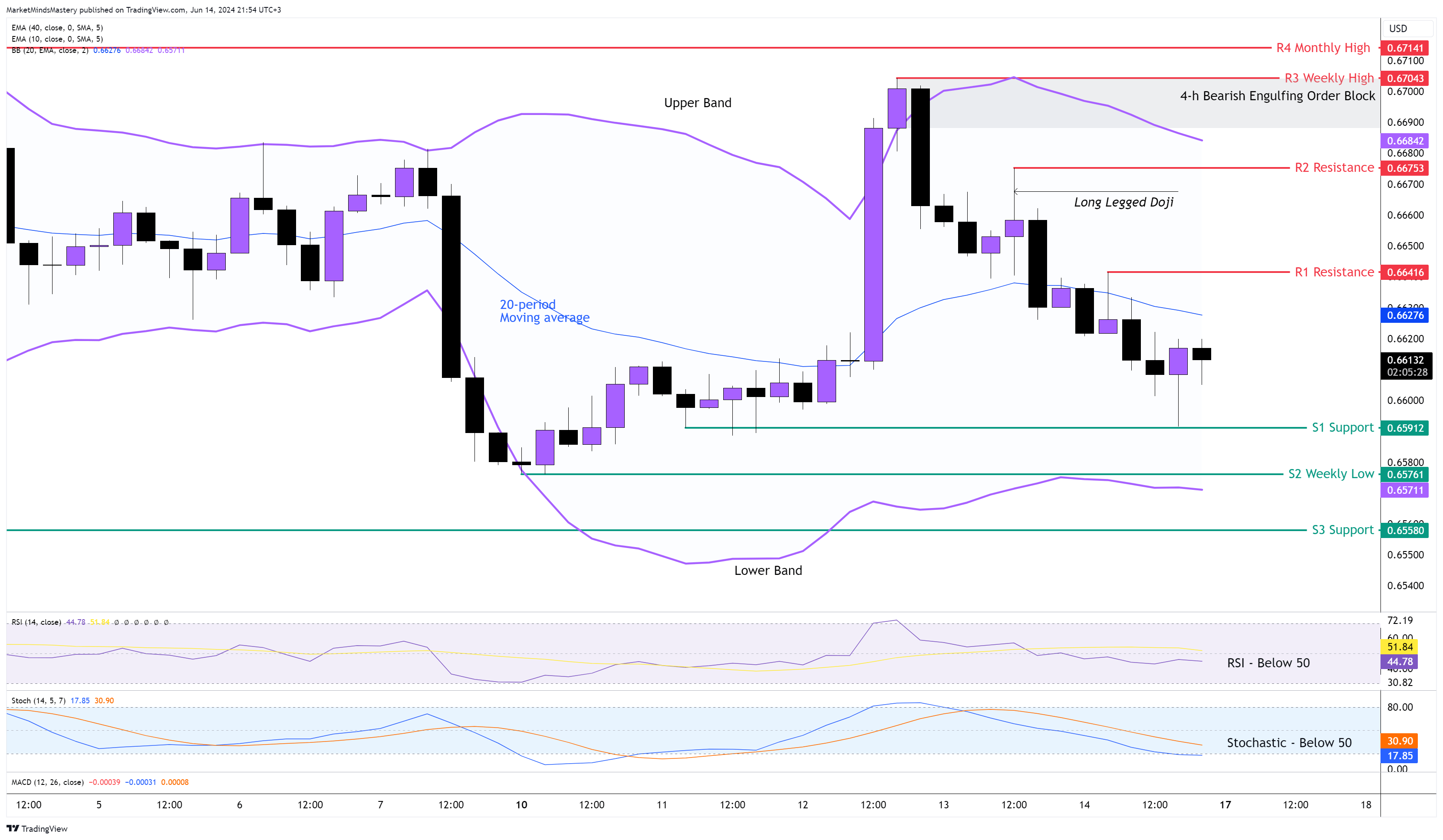 Both Oscillators, the RSI and the Stochastic, are under their middle lines, and this indicates that in the last 10-14 period on the 4H time chart, the price declined. The price is trading below the 20-period moving average, which has bearish implications on the short-term price move. If the price moves downwards, the first support area, S1, is around 0.65912. If the price penetrates the S1 and moves lower, the next support, S2, will be the previous week’s low, at 0.65761. This level clusters with the lower band of the Bollinger Band indicator. Moving further downwards, find the next support, S3, at around 0.65580.