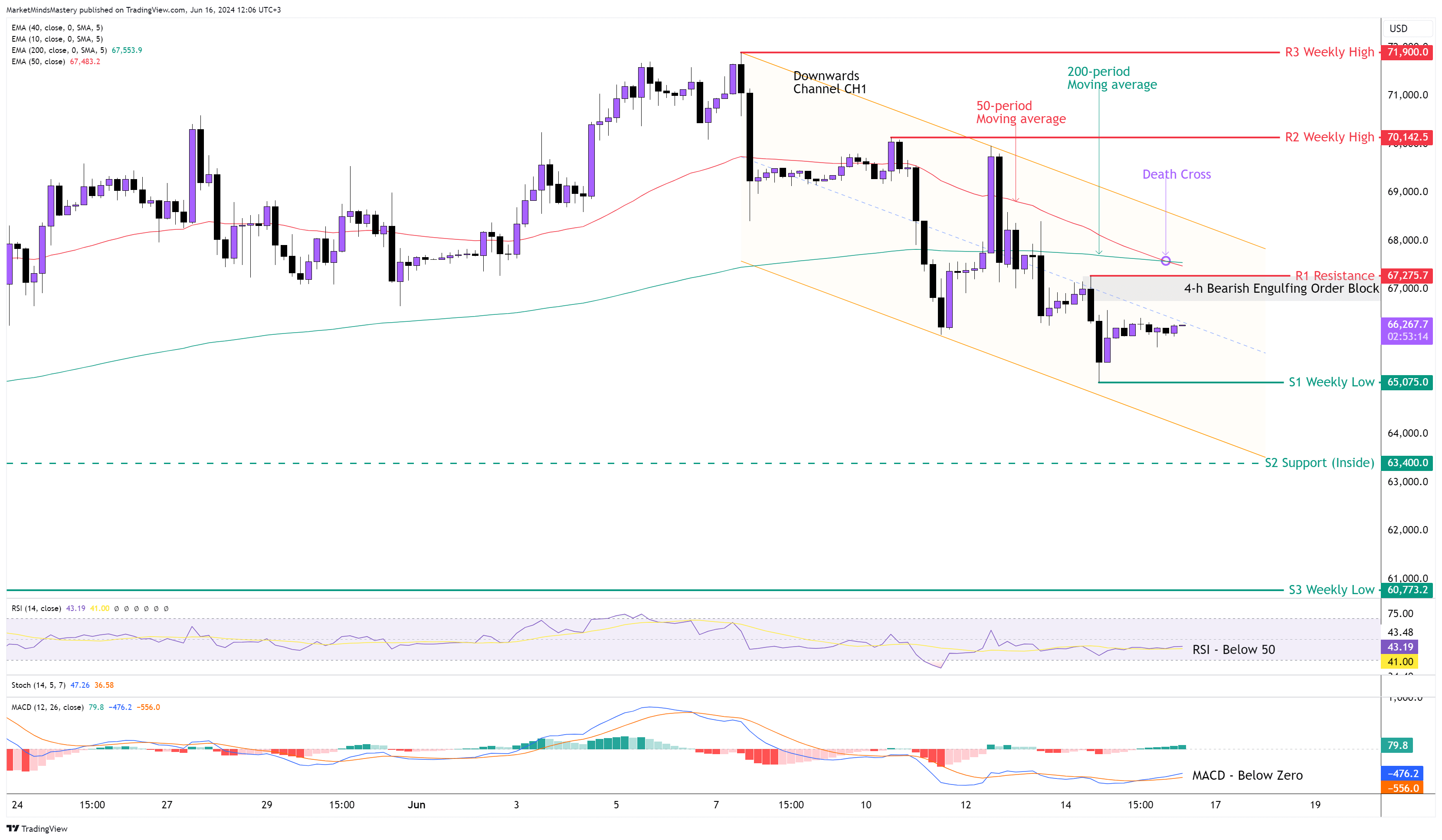 The most noticeable move on Bitcoin last week occurred during the Interest Rates announcement and the FOMC in the US. The price falsely broke (false breakout) the support level we market on the chart on to the previous market outlook, which acted as resistance after it failed, the 50-period and the 200-period moving averages. The weekly candle closed as a bearish candle. On the 4H chart, the price started a downtrend with a series of lower highs and lower lows. Currently, the price is trading within a Valid Downward Channel, CH1. The 50-period moving average crossed below the 200-period, shown as the “death cross” on the chart above. The RSI is below 50, which is bearish. The MACD created a Bullish Crossover under zero, indicating a price retracement phase may start. Therefore, if the price moves upwards, the first resistance area, R1, is around $67275. From this price level, a Bearish Engulfing Order Block was created last week. If the price penetrates the R1 and increases, the next static resistance area will be the previous week’s high, around $70142. Understand that the price can also find resistance at the upper line of the Downwards Channel CH1.