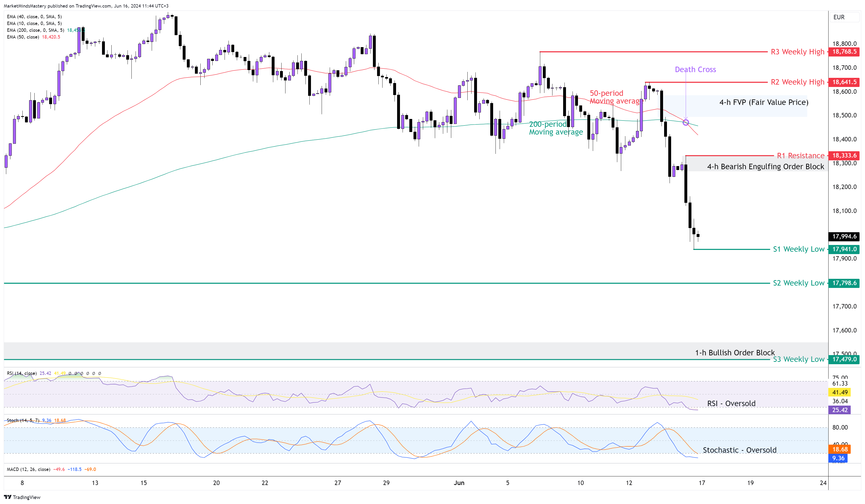 Following the retracement that started on the weekly chart a few weeks ago, the price last week declined and moved downwards, creating a series of lower highs and lower lows on the 4H chart. On the weekly chart, the price closed as a long Bearish candle, indicating an imbalance between buying orders and sell orders entered into the market. On the 4H chart, the 50-period crossed below the 200-period moving average, known as “the Death Cross”, which has bearish implications. Both oscillators, the RSI and the Stochastic, are in an oversold condition, and this is bearish. On the chart, we point to two Order Blocks: one Bearish Engulfing Order Block directly from the 4H chart and one Bullish Order Block that has been refined on the 1H chart. If the price continues to move downwards, the first area of support, S1, will be the previous week’s low, around 17941, which is a very close distance from the current price. If the S1 penetrates and the price declines further, the next support areas, S2 and S3, are both weekly lows at 17798 and 17479, respectively.