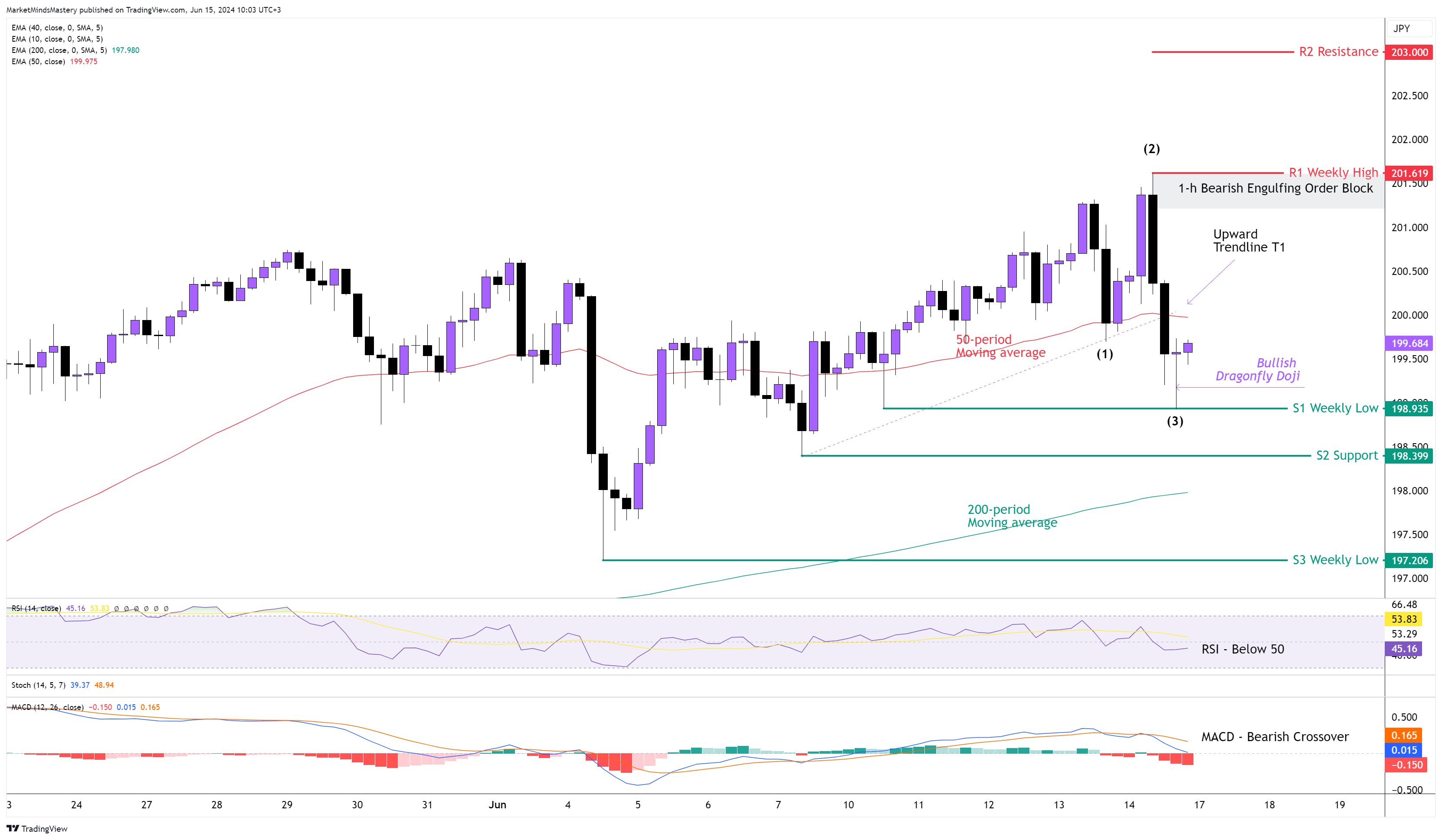 If the price declines and moves lower, the first support area, S1, will be around 198.93. Further downwards, move to find the next support, S2, around 198.399 and S3, around 197.20, which is a weekly low. On the other hand, if the price moves upwards, the first resistance area, R1, is approximately 201.61, which was the previous week’s high. A further upward move is to find the next resistance R2 around 203.