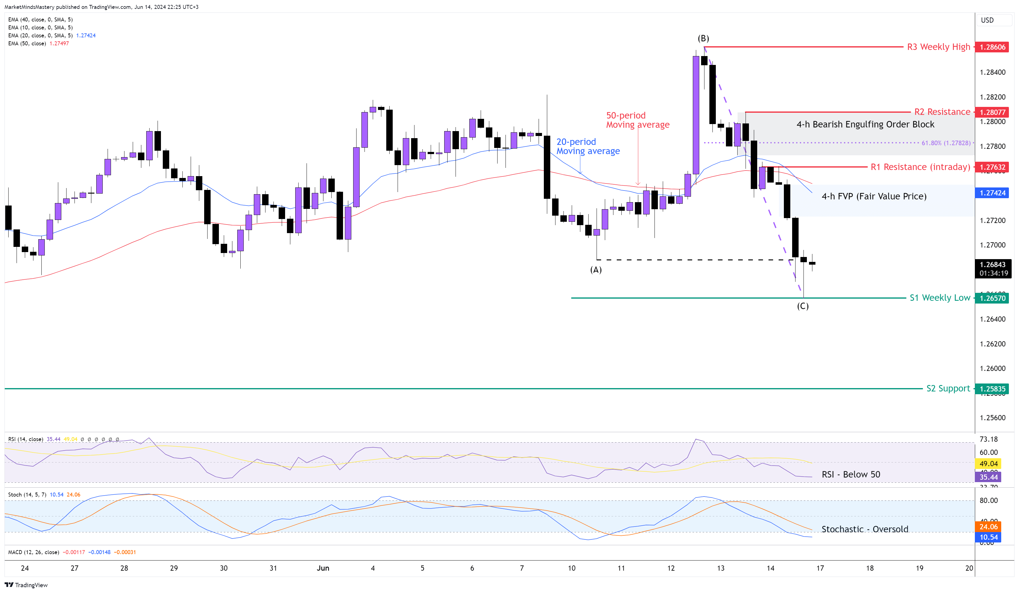 On the 4H chart, the price broke the uptrend structure as the low at point (A) penetrated by the Low at point (C ). As the price didn’t move fast downwards after the breakout, it instead created a reversal candle with a long lower wich, as per point ( C), so the breakout needs to be suspected, at least temporarily. The 20-period crossed below the 50-period moving average, and this has bearish implications. Also, the RSI is below 50, and the Stochastic Oscillator is in an oversold condition, which also has bearish implications.