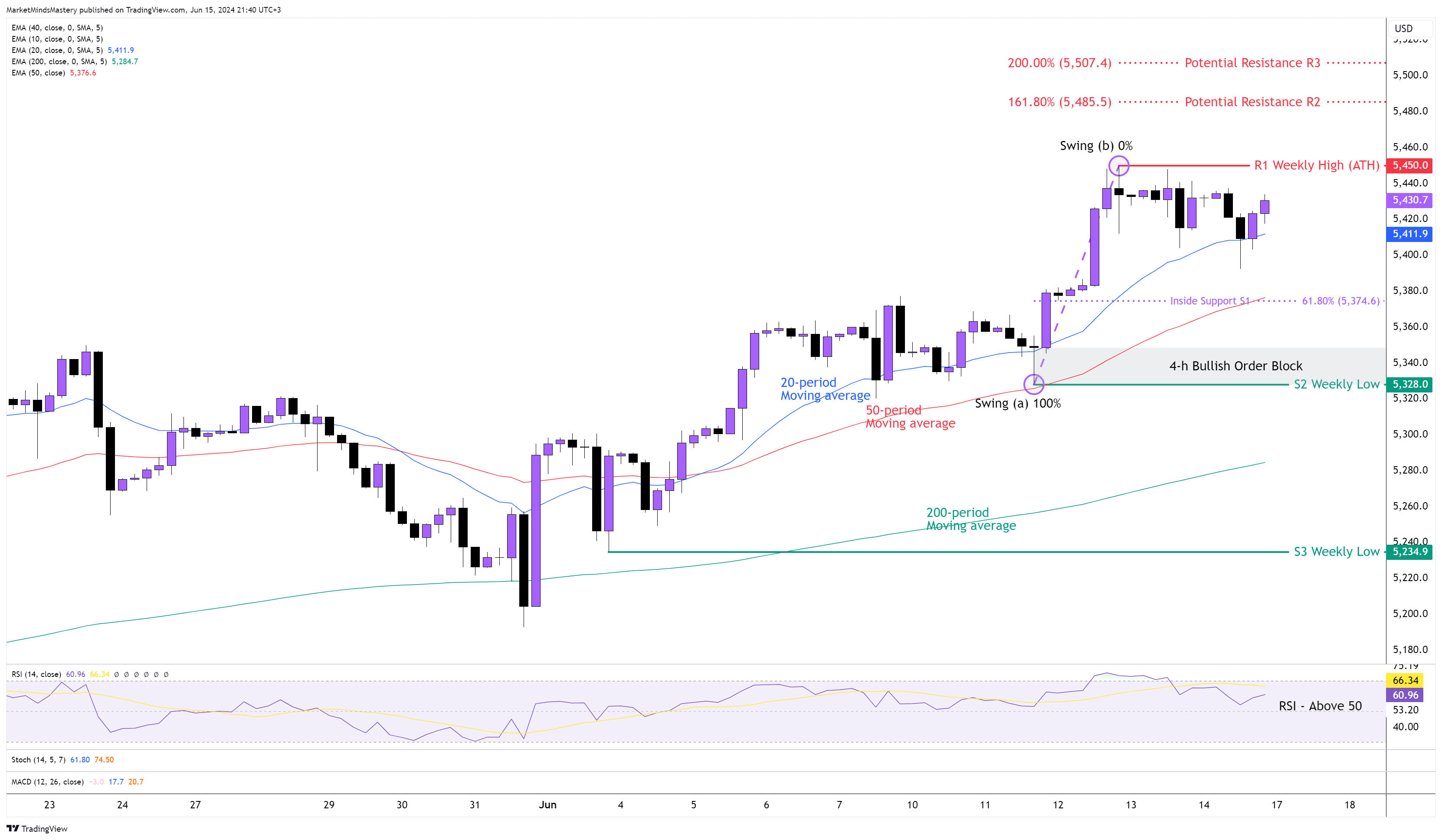 Starting Monday, if the price moves upwards, the first resistance area, R1, will be the ATH around $5450. If the price penetrates the R1 and increases, the next resistance areas will be forecasted with the Fibonacci extension, with the 161.8% being the R2 resistance around $5485 and the 200% being the R3 around $5507. Conversely, if the price moves downwards, the first support area, S1, will be the inside support around $5374, which is at the same level as the Fibonacci retracement from swing (a) to swing (b). If the price doesn’t bounce off, moves upwards, and keeps declining, the next support area, S2, will be the previous week’s low, around $5328. If the price breaks below the S2, the uptrend will come to an end.