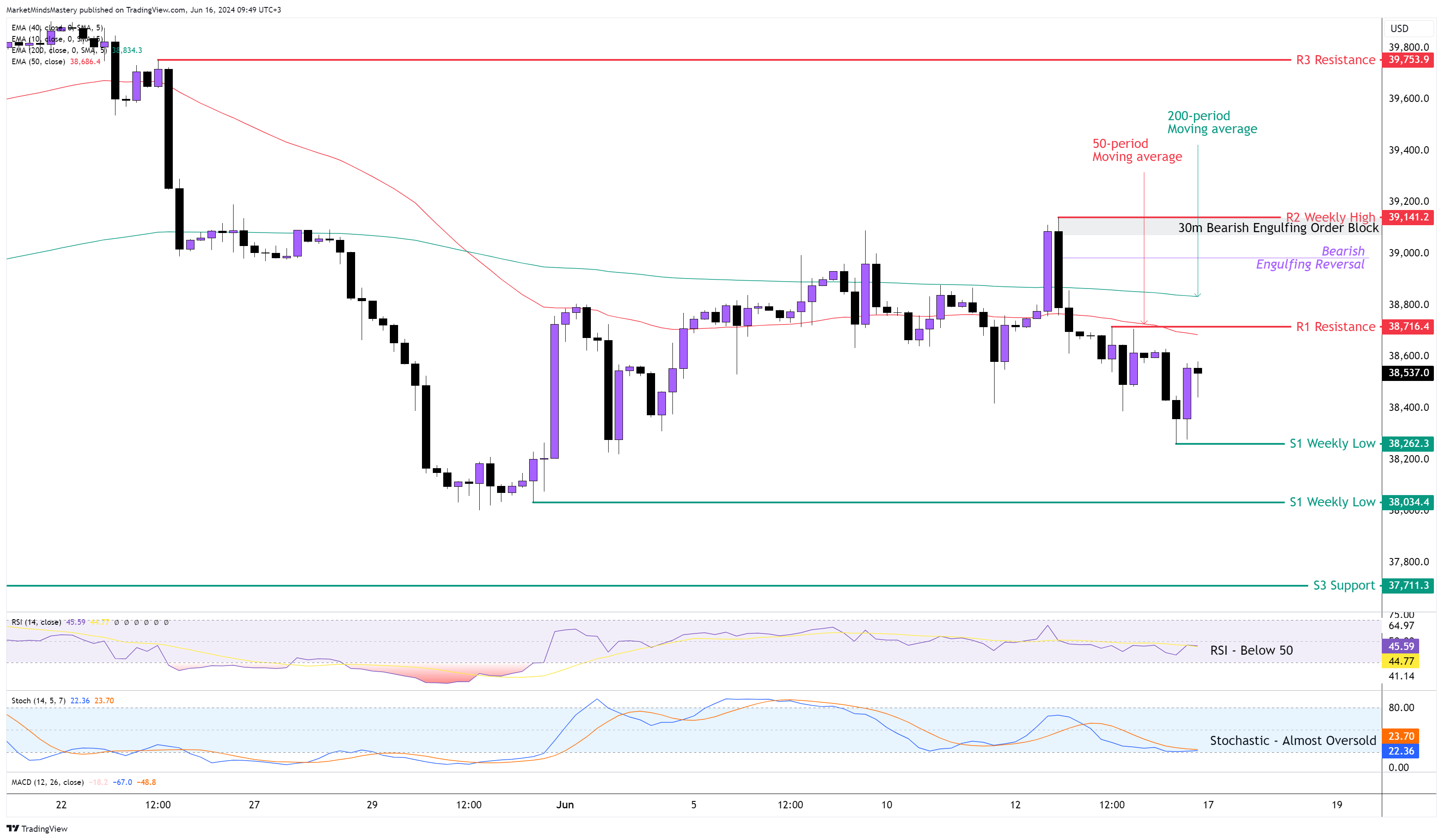 On the other hand, if the price bounces off and moves upwards, the first resistance area, R1, is approximately $38716, and it is close to the 50-period moving average. If the price penetrates R1 and moves upwards, the next resistance area, R2, will be the previous week’s high, at around $39141. On the chart, we marked the refined 30-minute Bearish Engulfidn Order Block.