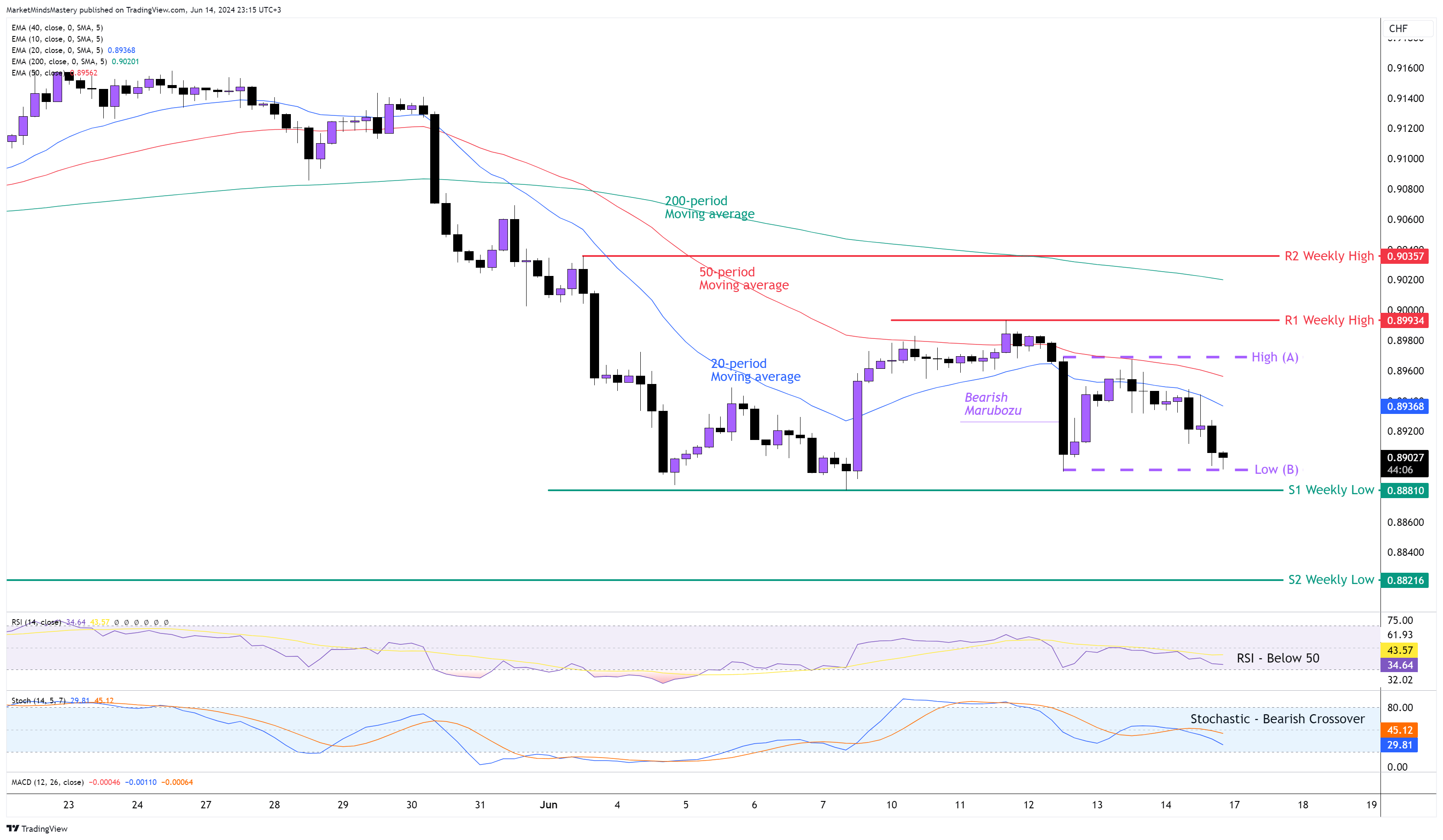 On the weekly chart, the price remains as an inside candle, which explains the market structure we see on the 4H chart. Since last Wednesday, the price has been trading within the Bearish Marubozu candle’s High (A) and Low (B) boundaries.