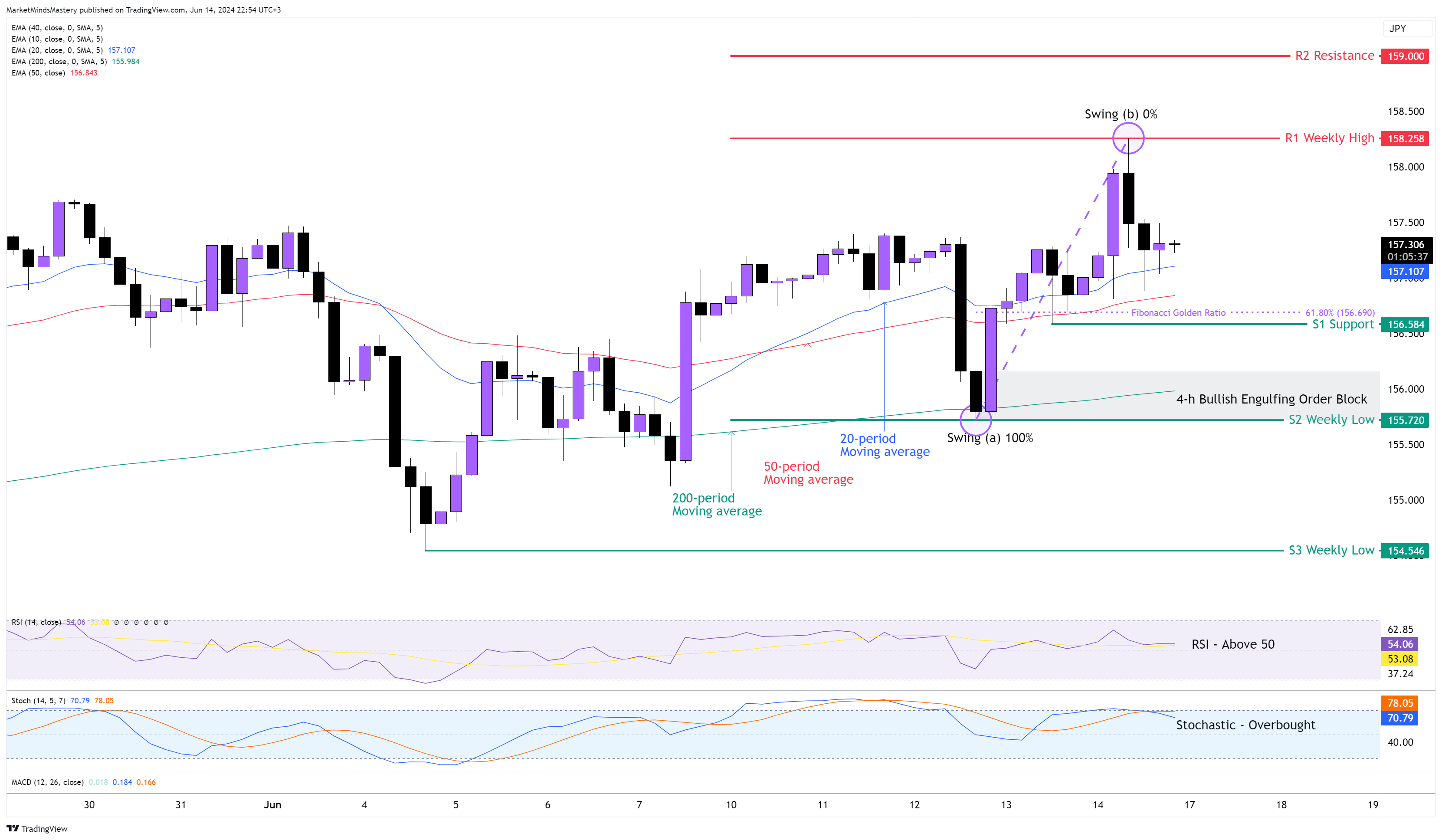 On the 4H chart, the 20-period moving average is above the 50-period, and the 50-period is above the 200-period. The RSI is above 50, which is also a bullish indication, and the Stochastic Oscillator is at 70. That shows a bullish market. If the price continues moving upwards, the first resistance area, R1, will be the previous week’s high, around 158.25. If the price penetrates the R1 and moves higher, the next resistance area, R2, is approximately the 159 level.