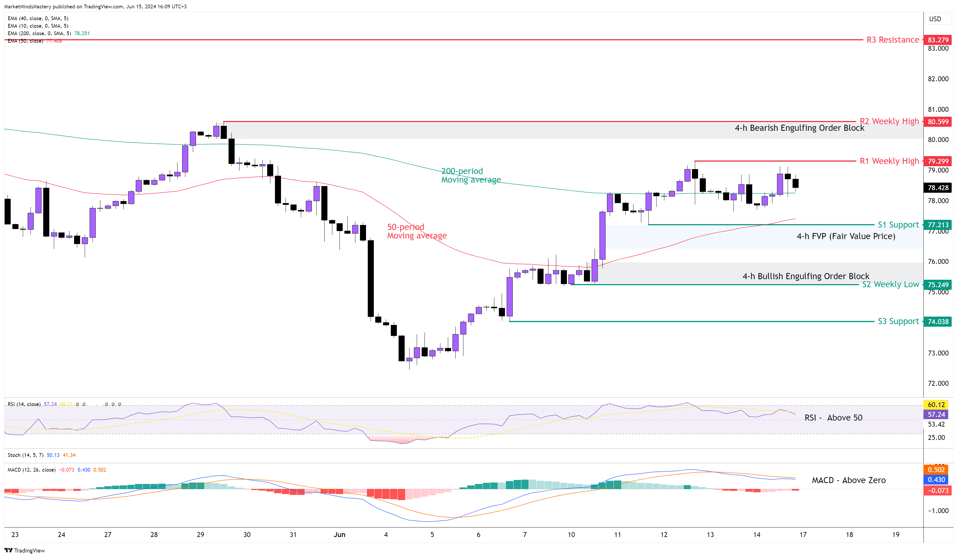 Starting Monday, if the price moves upwards, the first resistance area, R1, is around $79.29, which is the previous week’s high. If the price penetrates the R1 and moves higher, the next resistance area, R2, is another weekly high of approximately $80.60. Oppositely, if the price moves downwards, the first support area, S1, is around $77,21. At this level, the price left an FVG last week. If the price declines further, the next support area, S2, is at $75.25, with a Bullish engulfing Order Block being formed.