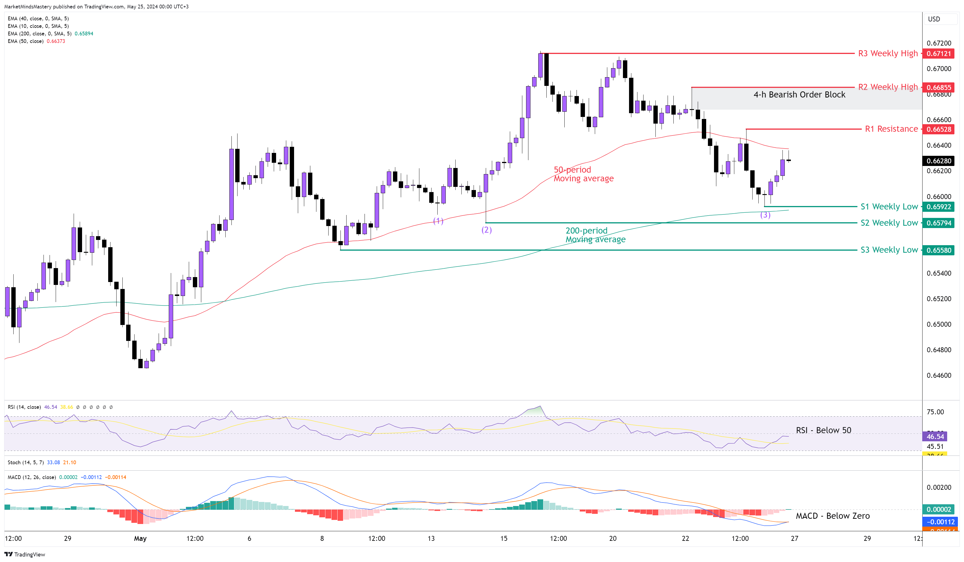 If the price keeps moving downwards, the first area of support is a confluence of the previous week’s low around 0.65922 and the 200-period moving average. Only ten pips below is another weekly low, which will be the S2 support if the price penetrates the S1 and moves downwards. Both the S1 and the S2 we can consider them as a zone because of the candles marked with (1), (2), and (3). These three candles have long wicks and have recently rejected the area between 0.6600-0.65794. If the price keeps lowering, the next support level will be the S3 weekly low of around 0.65580.