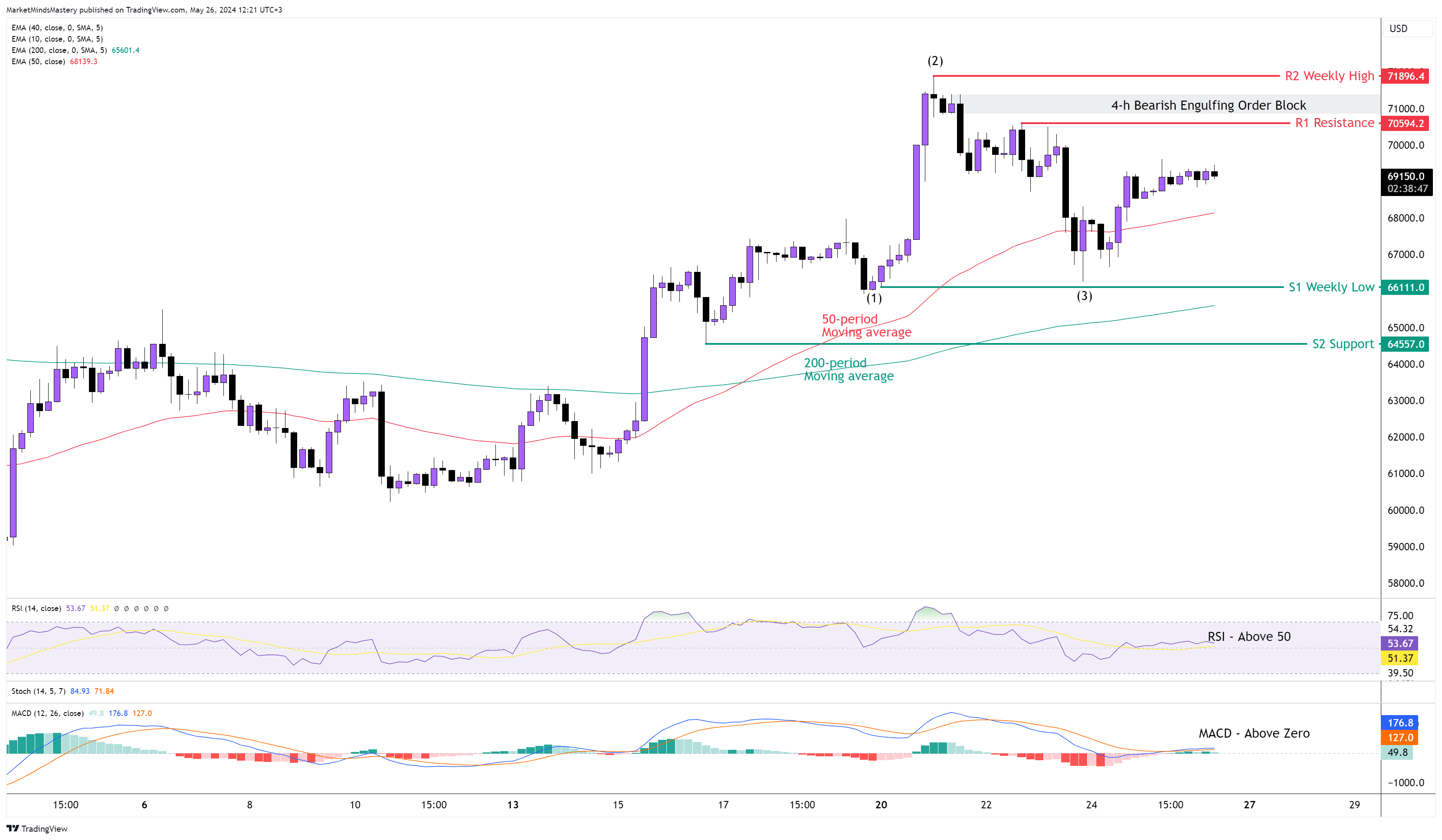 The enthusiasm among traders and investors is the primary force behind the upward momentum in cryptocurrencies. With Bitcoin leading in volume and price, the market, for another week, rallied and created a higher high and higher low on the 4-hour chart. Currently, the rising prices keep the 50-period moving average above the 200-period moving average. The RSI oscillator is above 50, a clear indication of an uptrend. The MACD is above the zero line, and this has bullish implications. The MACD Line (blue) croissant above the Signal Line (orange), which the indicator trades above zero, confirms the market’s uptrend. The swing at point (3) almost traded at the same level as at point (1), indicating some kind of market weakness. Starting Monday, if the price continues to increase, the first resistance area, R1, will be $70594, a level tested twice last week. If the price penetrates the R1 and moves higher, the next resistance area, R2, is around $71896. This is the previous week’s highest price and an area with a Bearish engulfing Order Block.