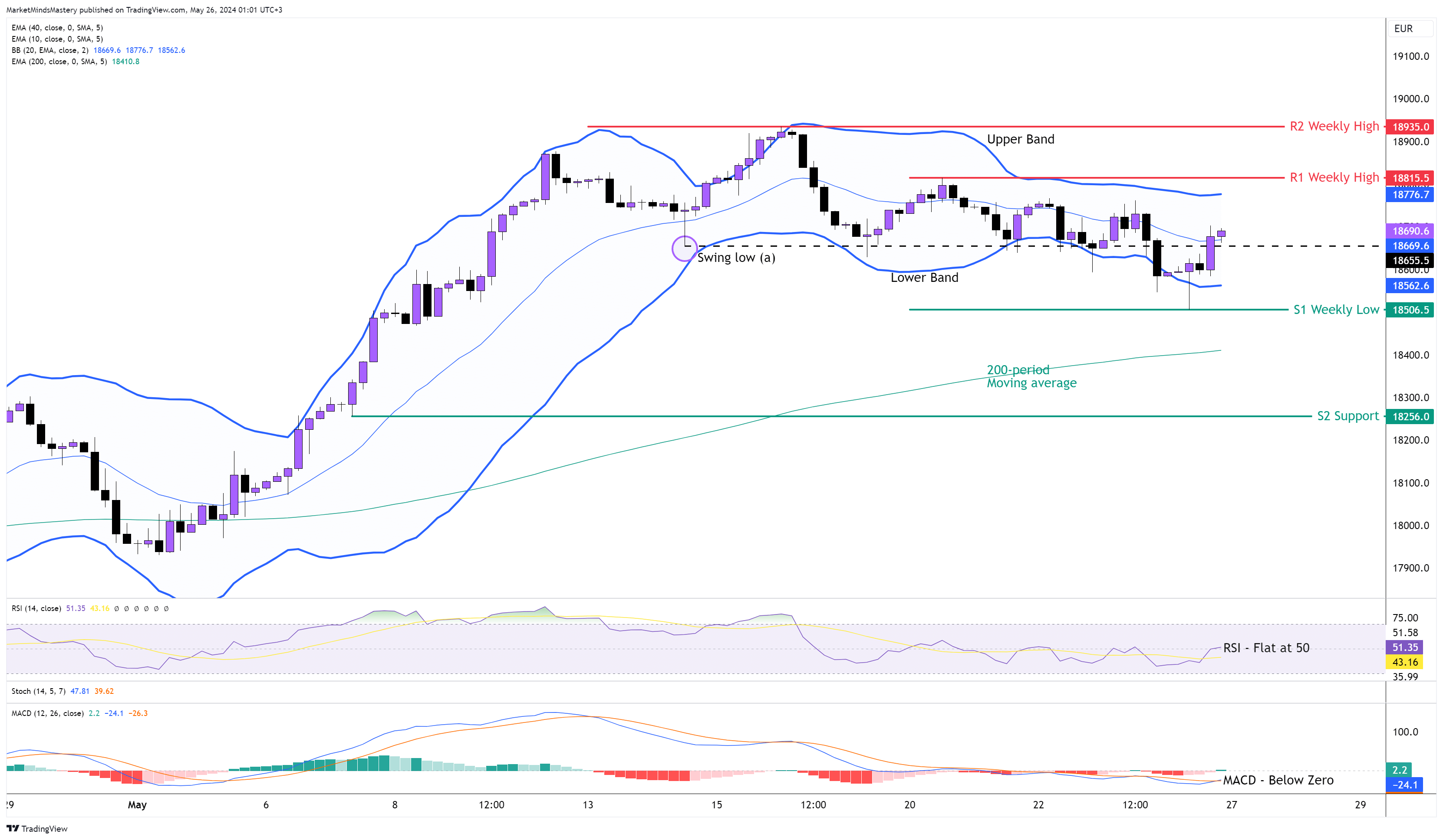 On the contrary, if the price is rejected and moves downwards, the first support area, S1, will be $18500, the previous week’s low. A close under the S1 and a move lower finds the 200-period dynamic moving average acting as a potential support. If the price moves under the 200-period, it will find the next support, S2, around $18256.