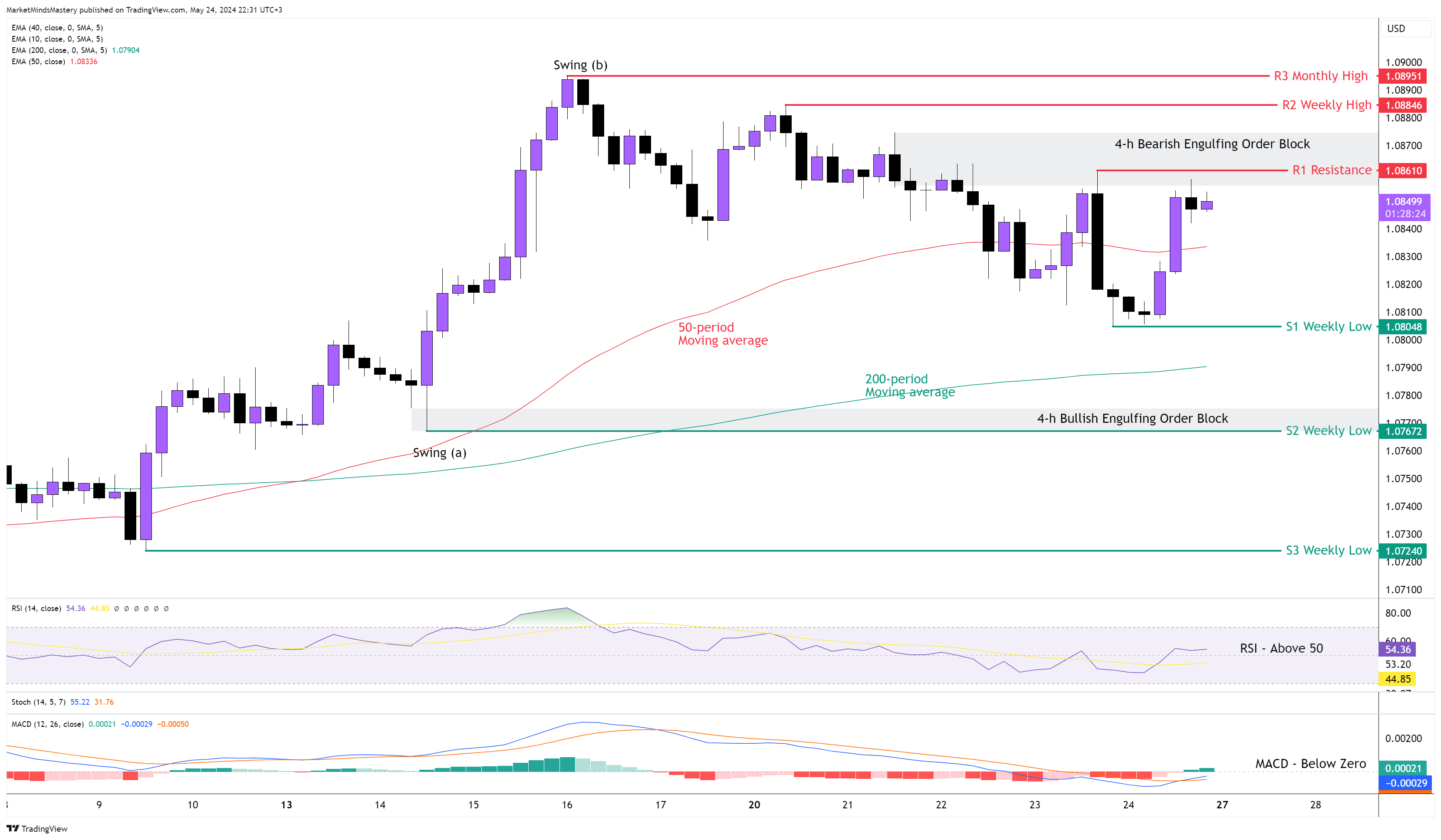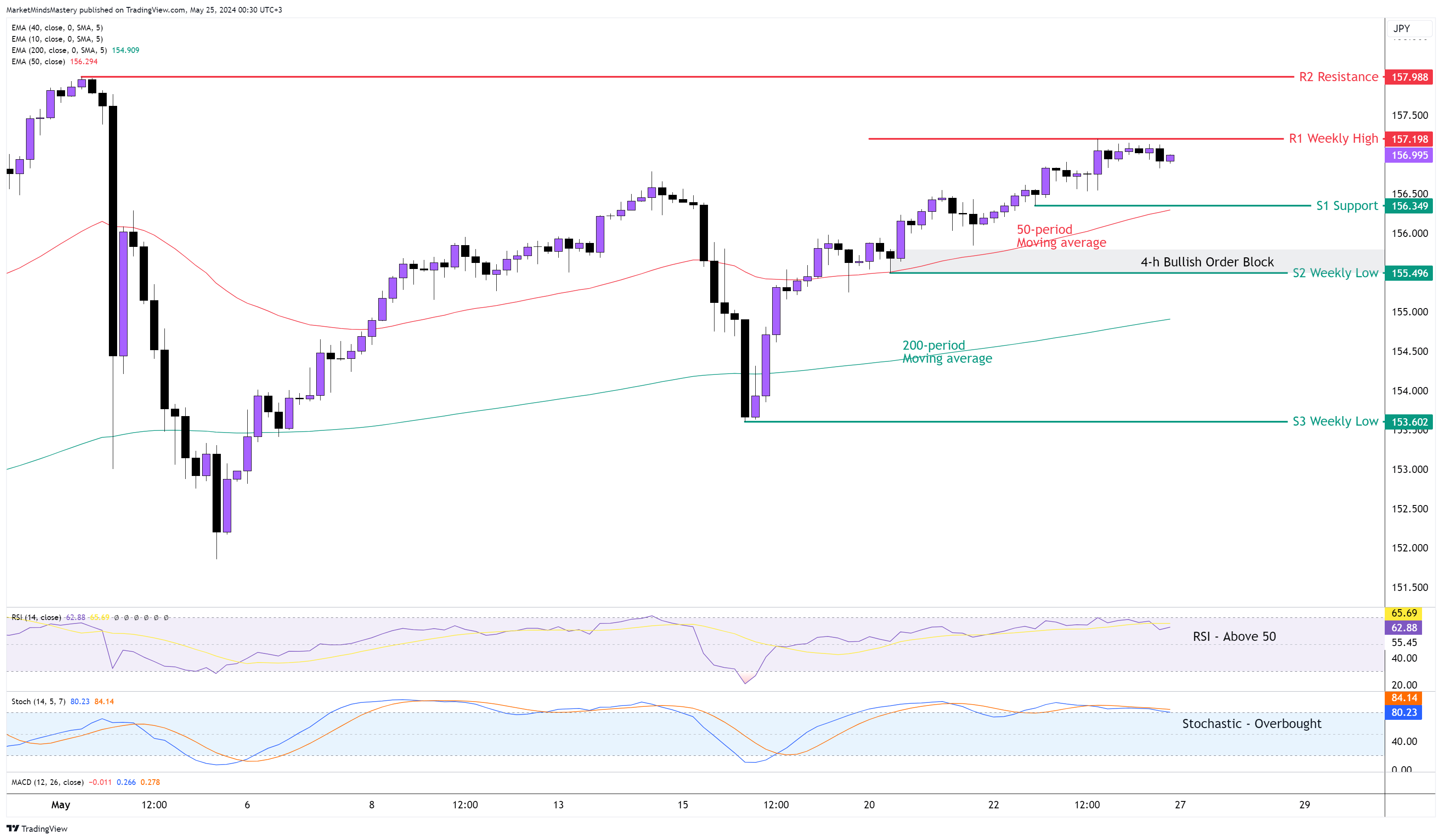 On the other hand, if the price is rejected and moves downwards, the first support area, S1, is expected to be at the 156.349 level. This is a swing low and is expected to hold the price on a decline if the uptrend continues. If the price breaks and closes under their S1, the next support area, S2, will be the previous week’s low, around 155.500, with a Bullish Order Block formed last week. A further decline can find the price to the dynamic 200-period moving average.