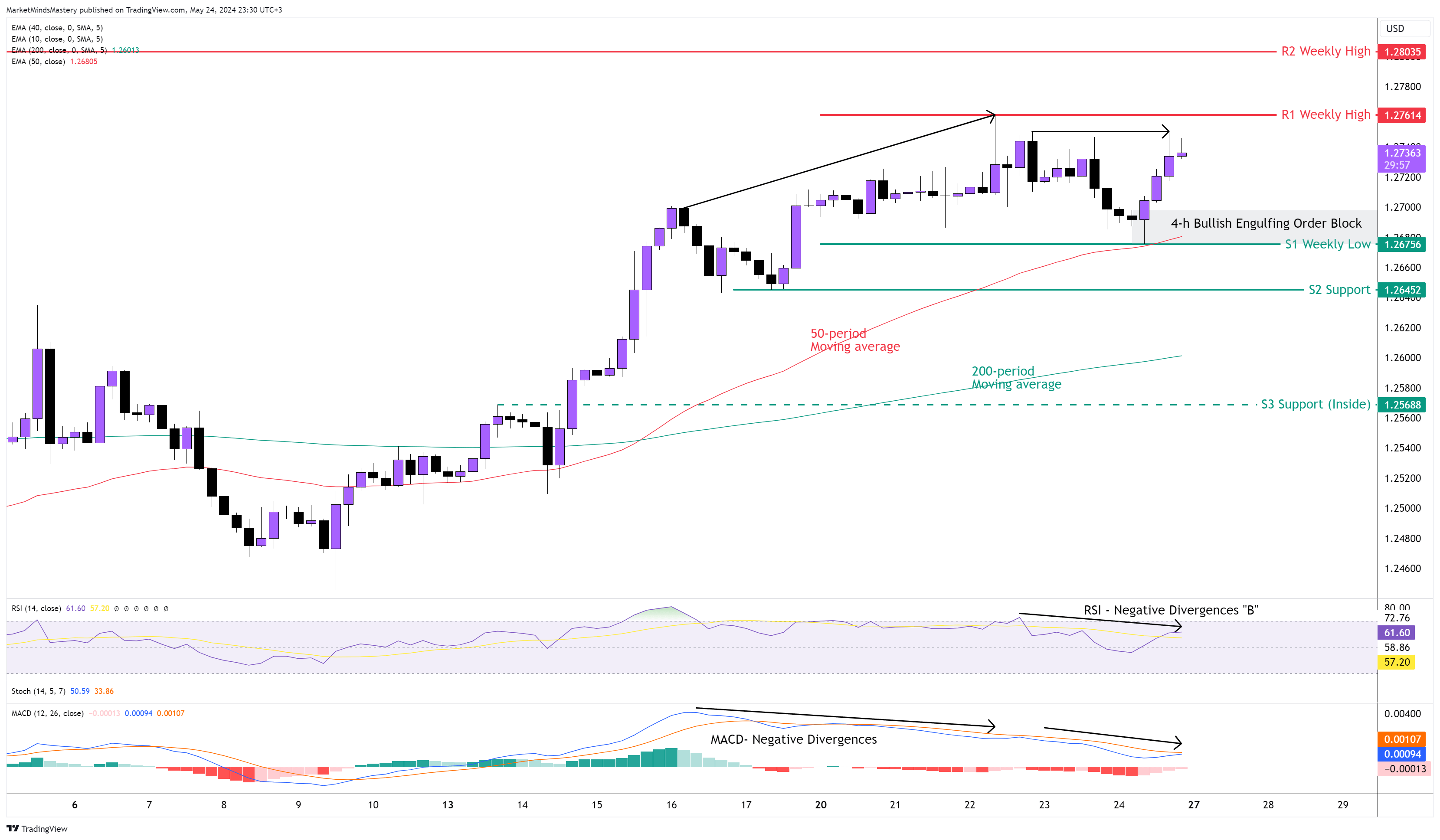 The lack of momentum was apparent on the MACD at the beginning of the previous week with the negative divergences as soon as the price made a new high, and the RSI oscillator with the most recent negative divergences "B" Class as the price made equal highs and the RSI lower highs. If the market performs with strength this week, and the Sterling sets for a new higher high, the Divergences can force the price to create a correction before the upward move. The moving averages also confirm the bullishness. The 50-period moving average is above the 200-period moving average. Starting Monday, if the price declines, the first support area, S1, will be the previous week’s low, around 1.26756.