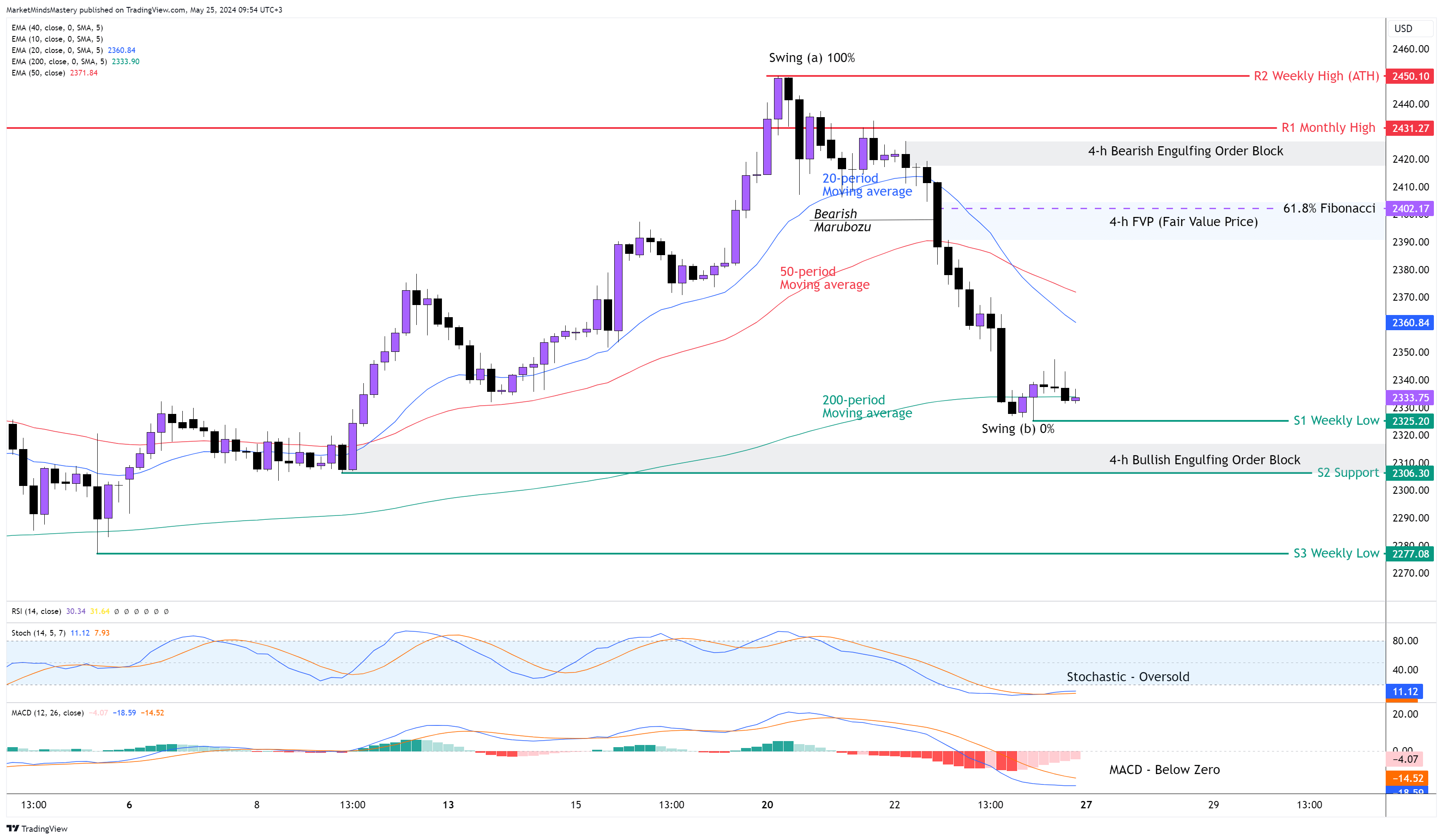 Following last week’s market outlook, the price interacted with the weekly resistance and created a False Break out. The price marked a new All-Time High (ATH) at around $2450. The FOMC last Wednesday fueled the decline of the GOLD, and the market created a downtrend on the 4-hour chart. The 20-period crossed under the 50-period moving average, which is a bearish sign. The price simultaneously made a Bearish Marubozu candle and a Fair Value Price (FVP). The price decline forced the MACD to move under zero, which is a bearish indication. Also, the Stochastic oscillator is in an oversold condition, indicating a strong downtrend. Currently, the price trades at the 200-period moving average, creating the first swing low (b). If the price keeps moving downwards, the previous week’s low, S1, will be the first area of support, around $2325. If the price penetrates the S1 and moves lower, the next support area, S2, will be the $2306. A well-defined Bullish Engulfing Order Block can temporarily act as a barrier to the price.