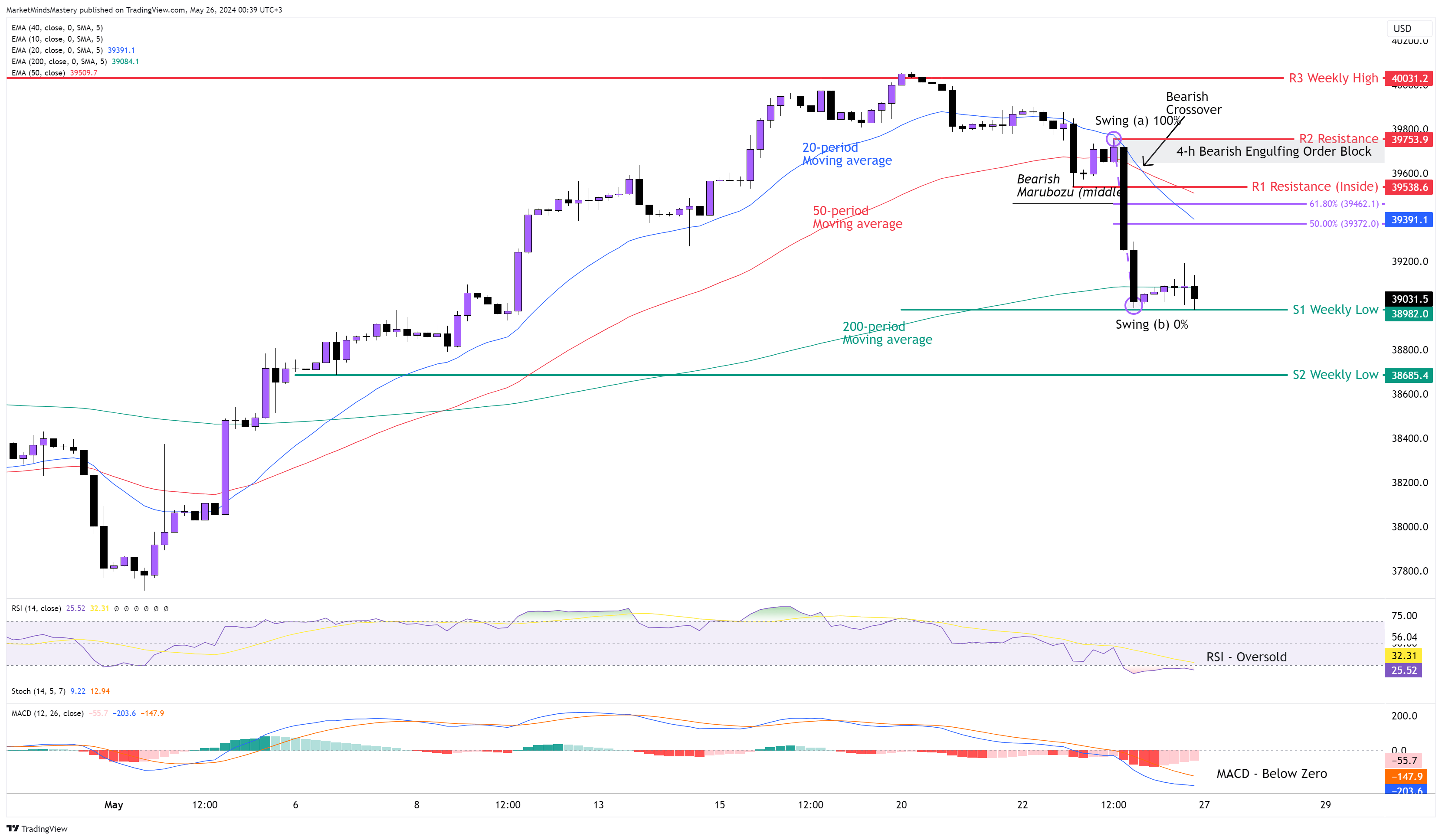 Currently, the price is at the 200-period moving average. If it finds support, bounces off, and moves upwards, the first resistance area, R1, will be the inside resistance around $39538. This price level is approximately the same area as the 61.8% Fibonacci retracement from swing (a) to swing (b) and with the middle of the bearish marubozu candle. If the price breaks above the R1, closes above it and moves upwards, the next resistance area, R2, will be around $39800.