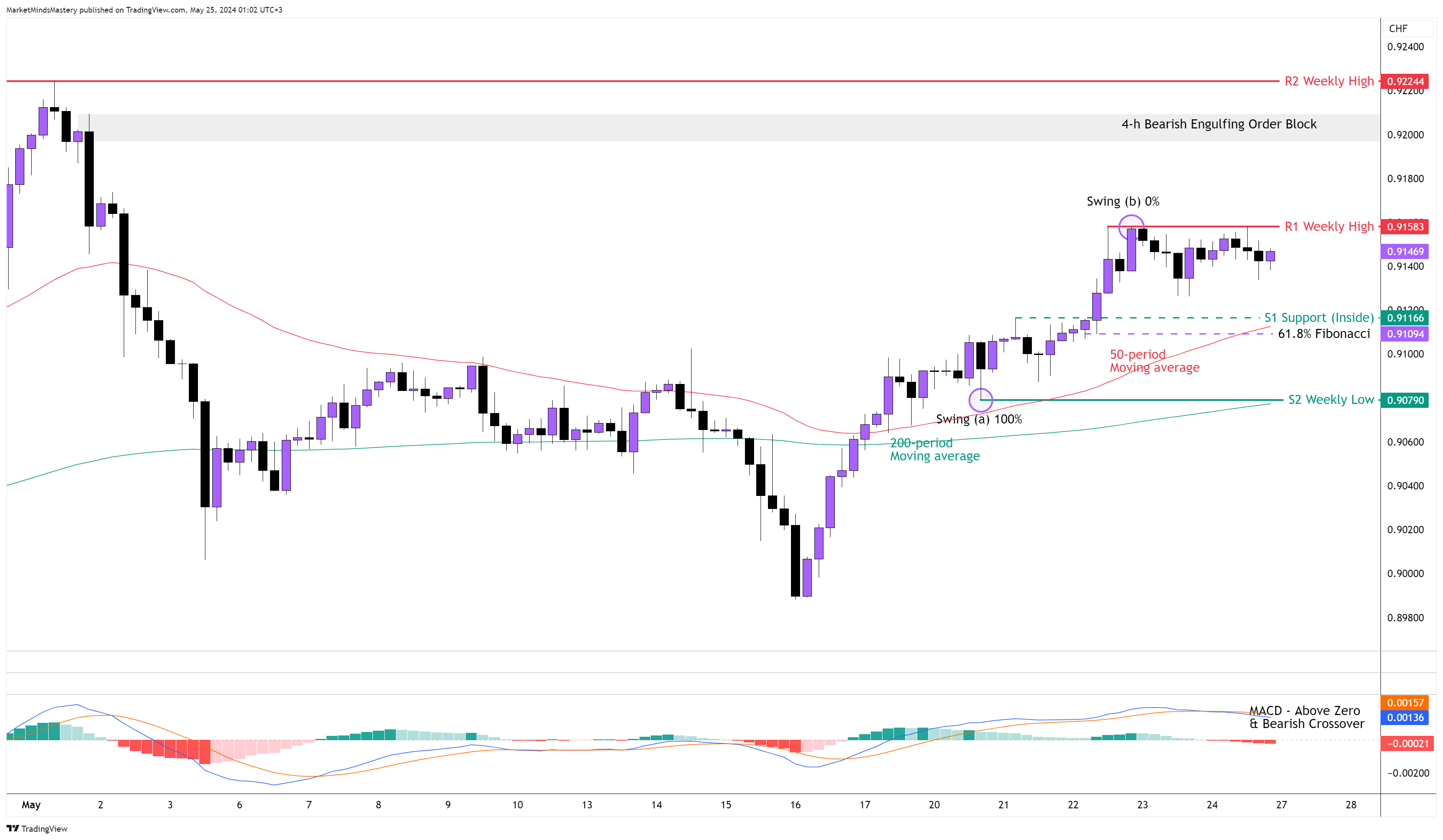 If the price moves downwards, the first support, S1, is an inside support, and it is around 0.91166. It is at a very close distance with the 61.8% Golder Ratio. This area can be considered significant, not only because of these two potential supports but also because of the 50-period moving average clusters with these levels. If the price declines further and moves downwards, the swing at point (a) will be the next support, S2, which is around 0.90790. This is the previous week’s low.