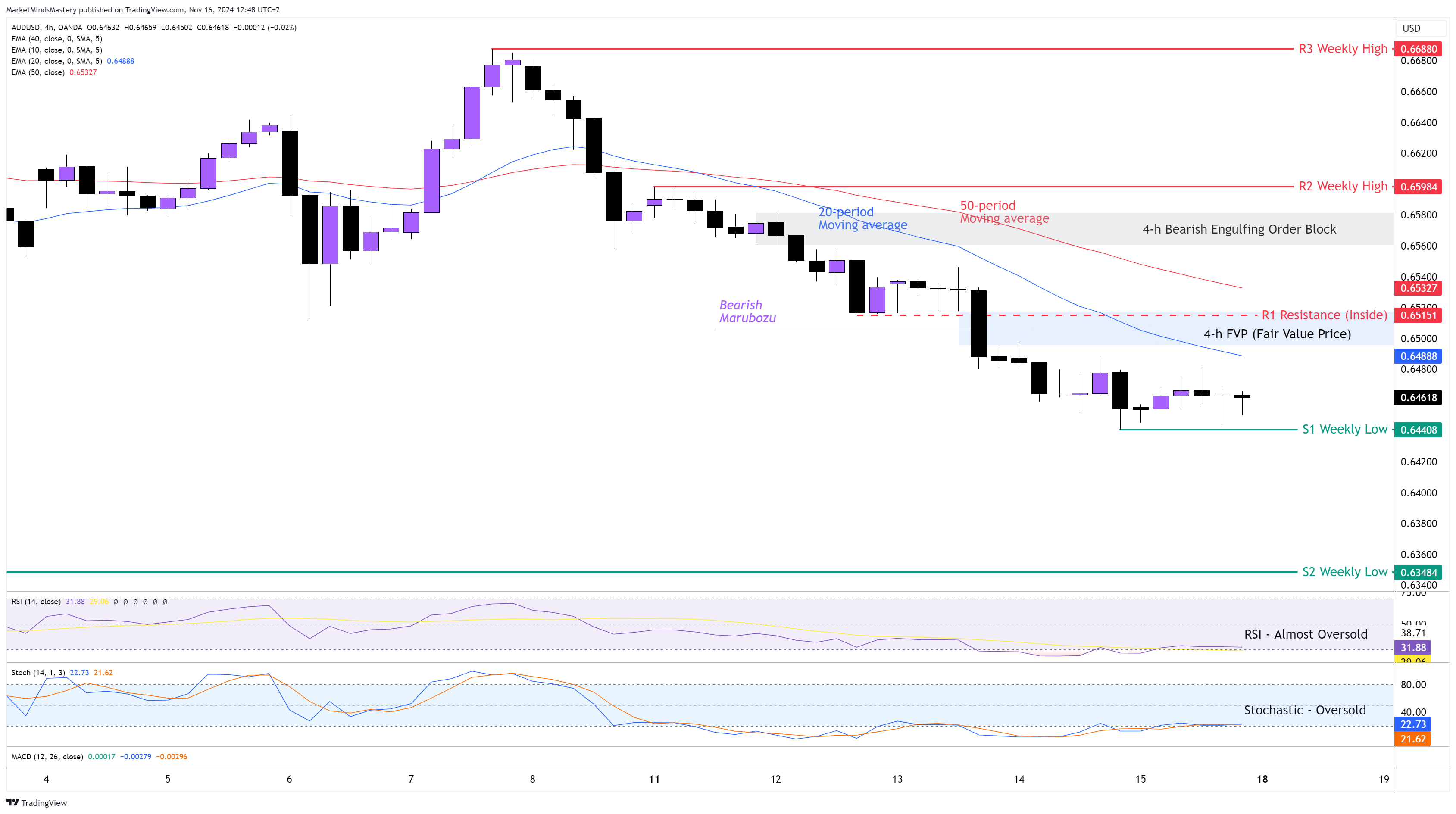 Similarly, the Stochastic Oscillator is almost at its Oversold condition, which has bearish implications. Starting Monday, if the price keeps moving downwards, the first support area, S1, will be around 0.64408, which is the previous week’s low. If the price penetrates the S1 and keeps moving downwards, the next support area, S2, will be at 0.63484, which is an older weekly level. On the other hand, if the price bounces off and moves upwards, the first resistance area, R1, will be an Inside resistance around 0.65151. This is considered a significant area because it coexists with the 4-h FVP and the 20-period moving average. If the price penetrates the R1 and keeps moving upwards, the next resistance, R2, will be at 0.65984, which is the previous week’s high.