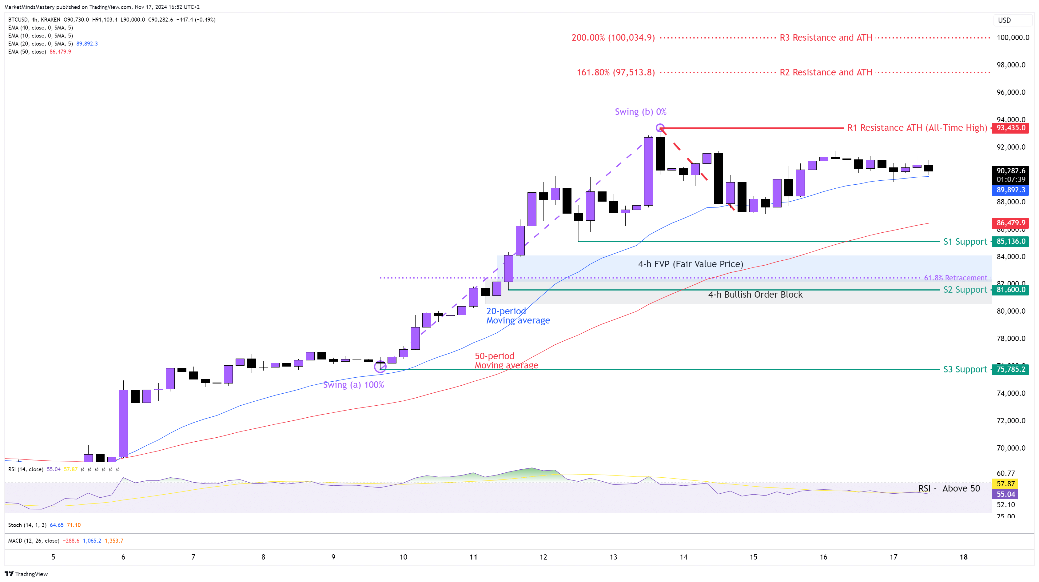 On the other hand, if the price is rejected and starts a retracement phase, it will start moving downwards, and the first support area, S1, will be around $85136. If the price penetrates the S1 and keeps lowering, the next support area, S2, will be at $81600. This is considered a key level of support as this consists of a Bullish Engulfing Order Block, an FVP (Fair Value Price) and the 61.8% Fibonacci Golden Ratio.