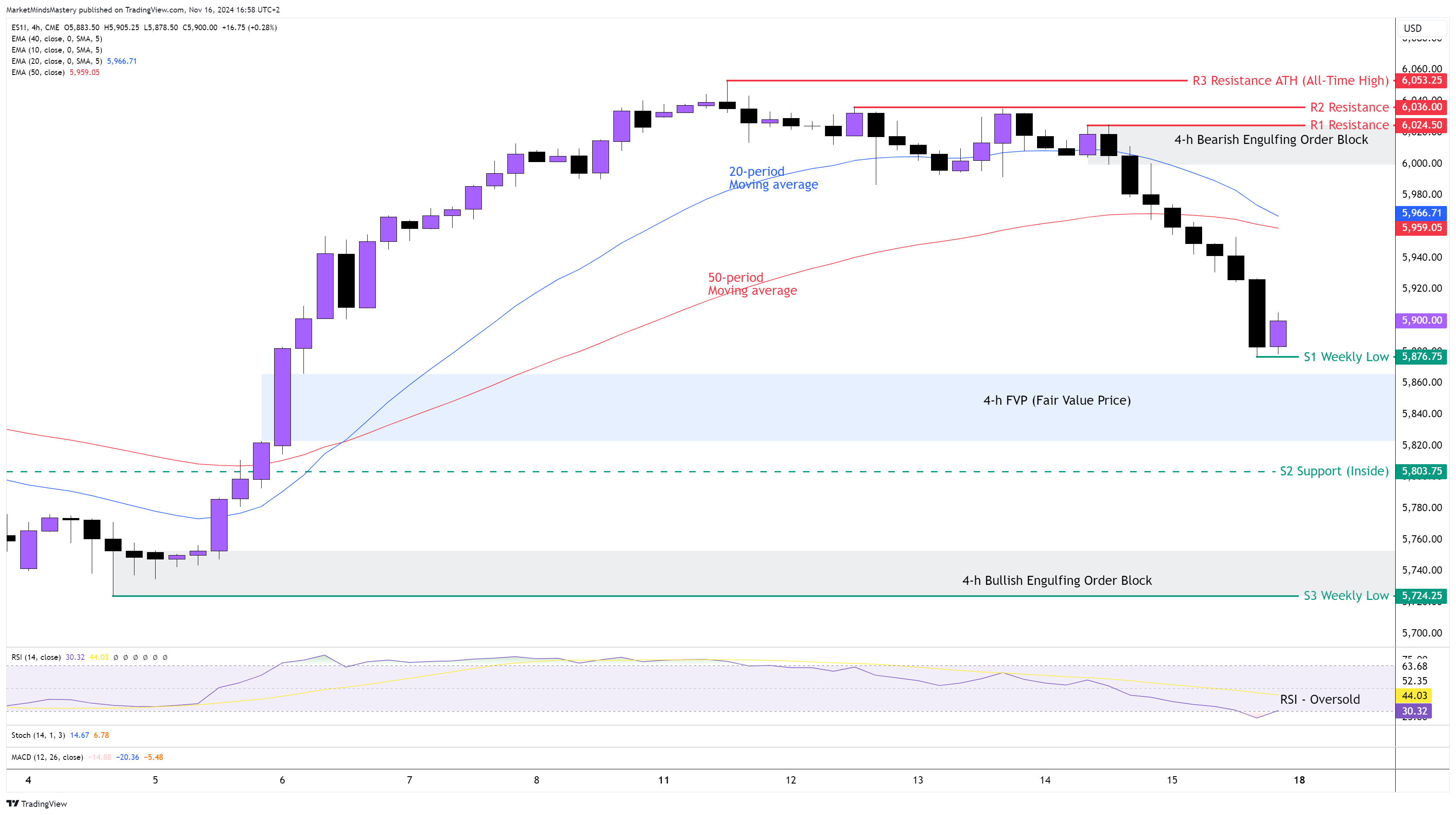 On the other hand, if the price moves upwards, the first resistance area, R1, will be $6024.50. A Bearish Engulfing Order Block was created last week at this level, and it hasn’t been tested yet. If the price penetrates the R1 and keeps moving upwards, the next resistance area, R2, will be $6036.