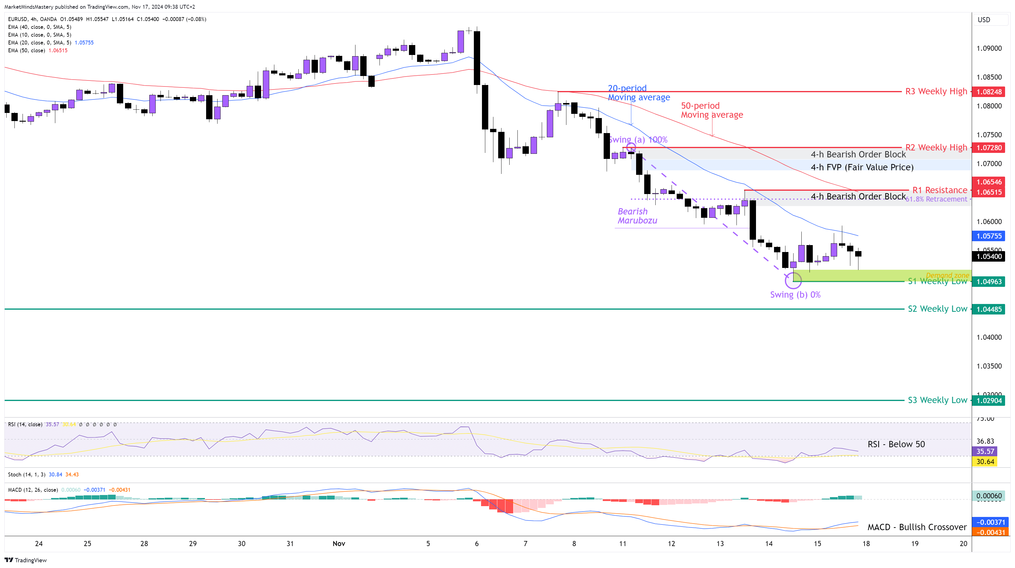 Last week, the price of the EURUSD experienced a significant drop of approximately 2300 points (230 pips). Therefore. The weekly candle ended as a Long Bearish Marubozu candlestick. On the 4-hour chart, the price on Monday created a Bearish Order Block around 1.07100 and an FVP (Fair Value Price) around 1.07000, as the price was creating lower low formations. Last Wednesday, a Bearish Marubozu candlestick continued the downtrend and left a new Bearish Order Block around 1.06500.