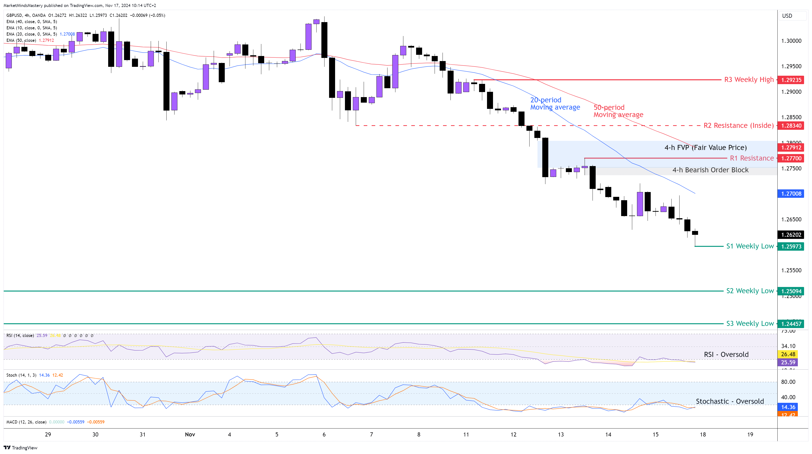 Following the previous week’s Market Outlook, the sideways move ended as a downward breakout. The weekly chart’s price action ended as a Bearish Continuation candlestick. On the 4-hour chart, the price created a series of lower highs and lower lows. Last Tuesday, during the New York trading session, the price created an FVP (Fair Value Price) around 1.28000. The price then consolidated for a while, and the next day, it continued with a new lower low formation, creating a Bearish Order Block around 1.27500. As per the moving average analysis, the 20-period is below the 50-period, and this is bearish. Both the RSI and the Stochastic Oscillators are in their Oversold condition, and this also has bearish implications. Therefore, if the price continues to move downwards, the first support area, S1, will be around 1.25973, which is the previous week’s low. If the price penetrates the S1 and keeps lowering, the next support area, S2, will be around 1.25094.