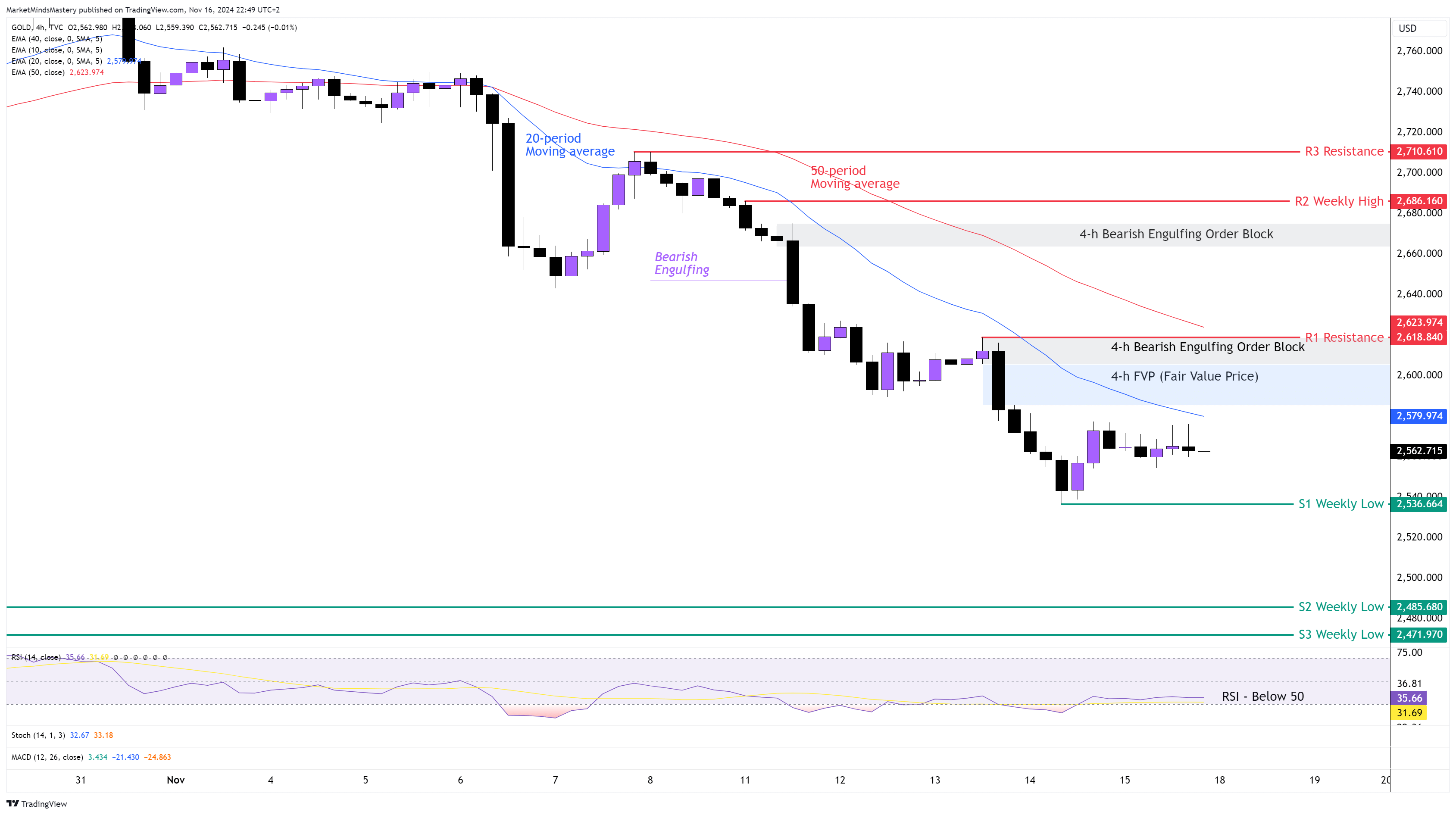 The price of GOLD declined for another week in raw. The weekly primary trend is an uptrend. However, on lower time frames, like the one in the 4-hour chart, the price created a strong downtrend with a series of lower highs and lower lows. On Monday and Wednesday, the price created two Bearish Engulfing Order Blocks around $2670 and $2610, respectively. Additionally, the strong sell-off of the price on Wednesday, during the New York trading session, created an FVP (Fair Value Price) of around $2600. The 20-period is below the 50-period moving average, and this is bearish. The RSI Oscillator is below its middle line of 50, which also has bearish implications. Currently, the price is below the 20-period moving average. If the price continues to move downwards, the first support area, S1, will be at $2536, which is the previous week’s low. If the price penetrates the S1 and keeps lowering, the next support area, S2, will be at $2485. Oppositely, if the price moves upwards, the first resistance area, R1, will be at $2623. This is considered a significant level of resistance because it consists of the 4-h Bearish Engulfing Order Block formed last Wednesday around $2600 and the 50-period moving average. If the price penetrates the R1 and keeps increasing, the next resistance area, R2, will be approximately $2686, which is the previous week’s high.