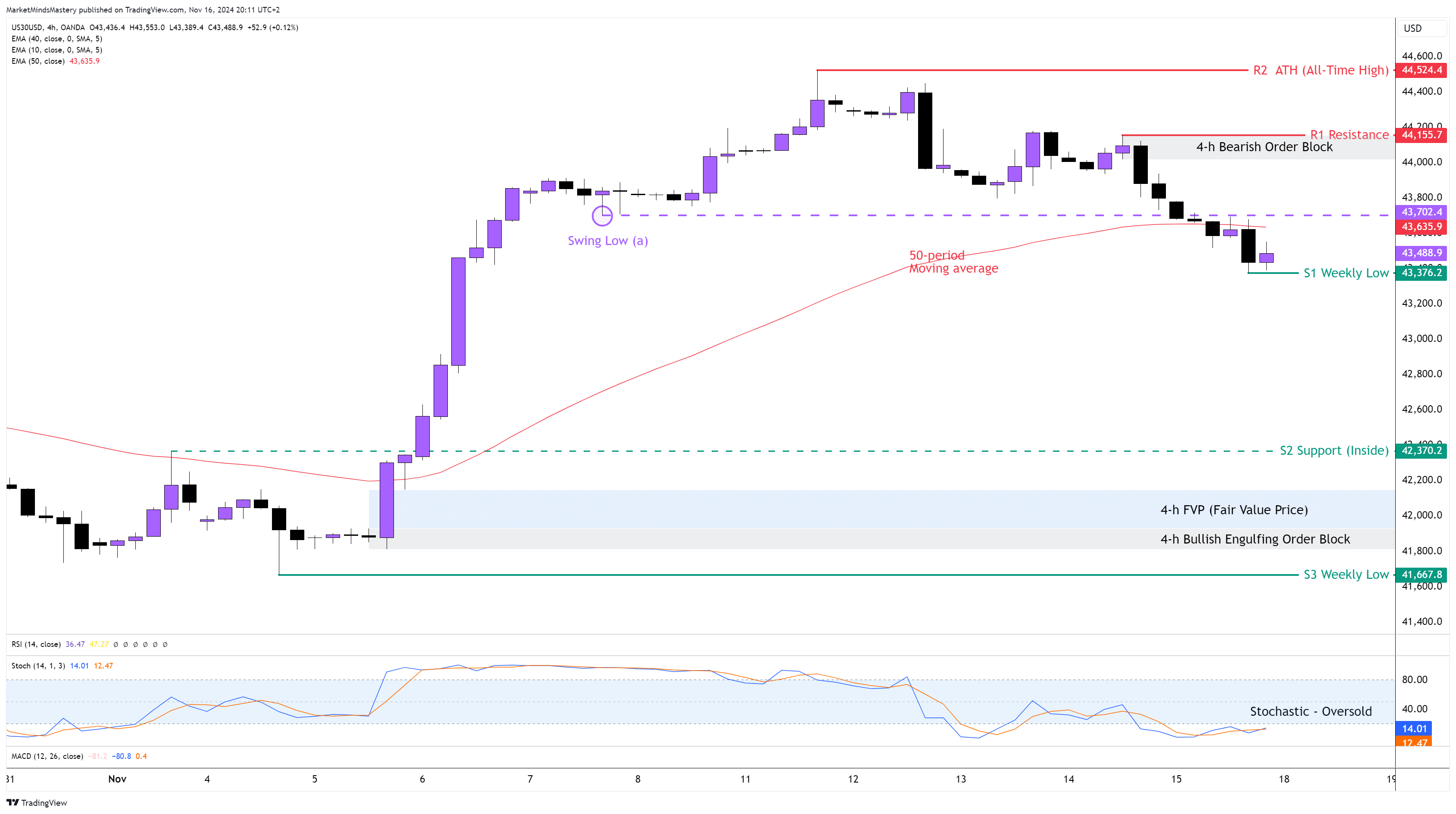 Following the previous week’s Market Outlook, the price of the US30 moved upwards, testing the 300% Fibonacci Extension around $44524, which created a new ATH (All-Time High). Since then, it has started moving downwards with large Bearish candles, as shown on the chart. Last Friday, the price penetrated the swing low at point (a), which was the origin of the last upward move, meaning that the uptrend is no longer valid. By the end of the New York trading session, the price closed below the 50-period moving average, and this has bearish implications. This also caused the Stochastic Oscillator to become Oversold, indicating the aggressive selling pressure of the US30 market by the selling orders. If the price continues moving downwards, the first support area, S1, will be at $43376, which is the previous week’s low. If the price penetrates the S1 and keeps moving downwards, the next support area, S2, will be an Inside support at $42370, which was created a few weeks ago. Oppositely, if the price bounces off and moves upward, the first resistance area, R1, will be at $44155. This is considered a significant resistance area as it coexists with the 4-h Bearish Engulfing Order Block created last Thursday, which caused the price to break and change the trend direction, as shown on the chart. If the price penetrates the R1 and keeps increasing, the next resistance area, R2, will be the ATH (All-Time High) at $44524.