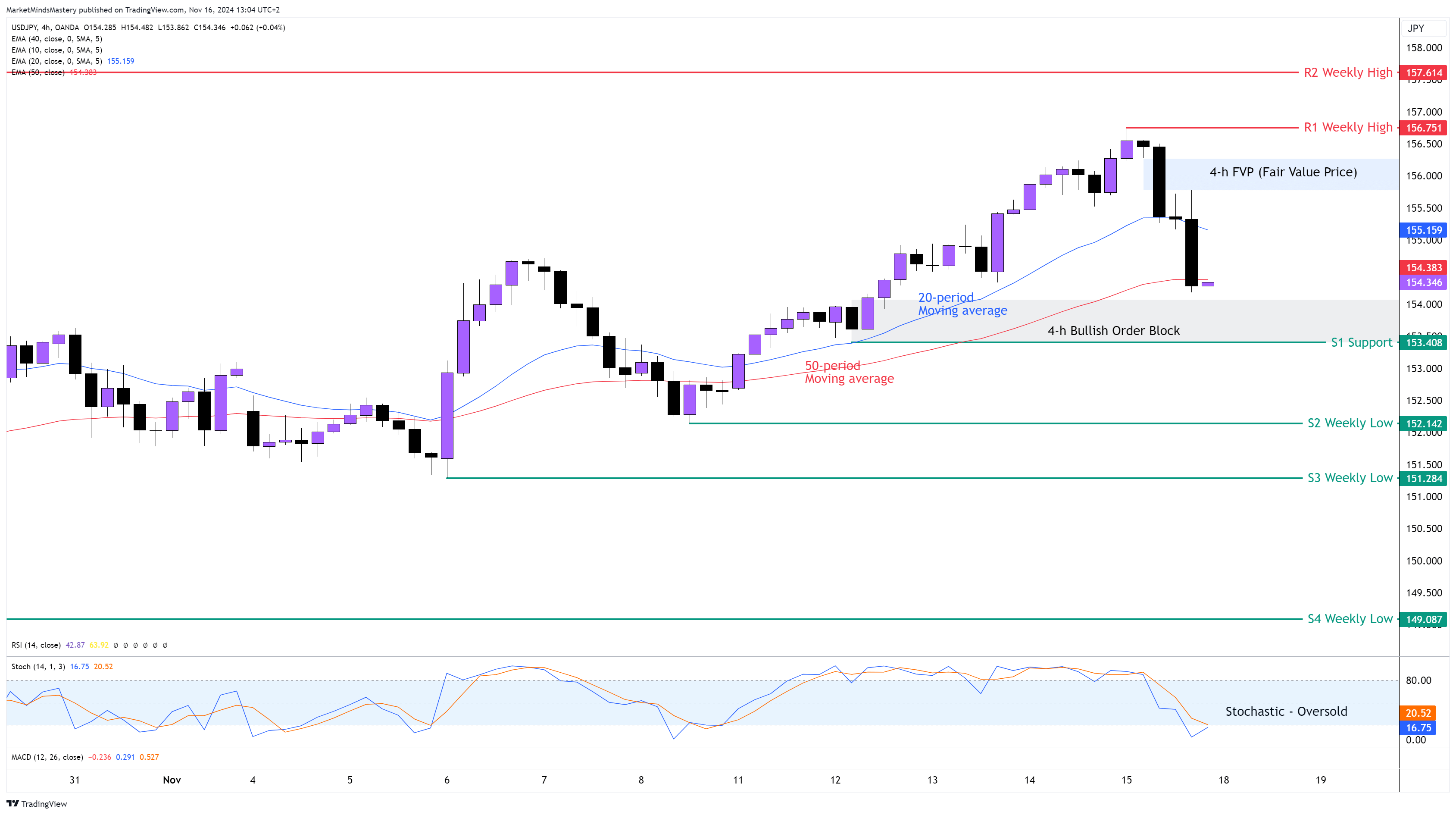 Despite the US Dollar’s strength last week, the Japanese Yen was the next strongest currency. Therefore, the price on the weekly chart ended as a Bullish candle but with a noticeable Upper Wick, which can cause some downside this week. On the 4-hour chart, the 20-period is above the 50-period moving average, and this is bullish. The price was making higher highs and higher lows until last Friday. Last Tuesday, the price created a Bullish Order Block of around 154.000. Lastly, on Friday, as the price declined, an FVP (Fair Value Price) was created around 156.000, which hasn’t been tested yet. The Stochastic Oscillator is in an Oversold condition, and this is bearish. Last Friday, the price entered into the Order Block area, and it also closed below the 50-period moving average, as shown on the chart.