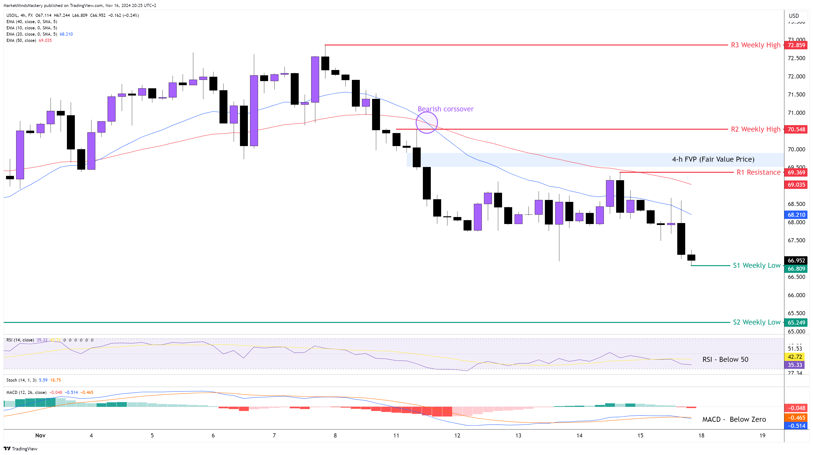 The way the weekly price action moved last week on the USOIL market could be described as a “textbook” example. The primary trend is a downtrend, and the reversal price action led to a downtrend continuation with a Bearish Marubozu candle. On the 4-hour chart, the 20-period crossed below the 50-period known as a Bearish Crossover. The RSI is below its middle line of 50, and this is bearish. Similarly, the MACD is below the zero line, which has bearish implications. Currently, the price has rejected the 20-period moving average, creating a lower high and lower low formation. Therefore, if the price continues moving downwards, the first support area, S1, will be around $66.80, which is the previous week’s low. If the price penetrates the S1 and keeps moving downwards, the next support area, S2, will be approximately $65.24. In case the price bounces off and moves upwards, the first resistance area, R1, will be around $69.36. If the price penetrates the R1 and keeps moving upward, there is an FVP (Fair Value Price) that was created last Monday at around $69.60, and it can act as a resistance area. If the price surpasses the FVP and keeps increasing, the next resistance area, R2, will be approximately $70.54, which is the previous week’s high.