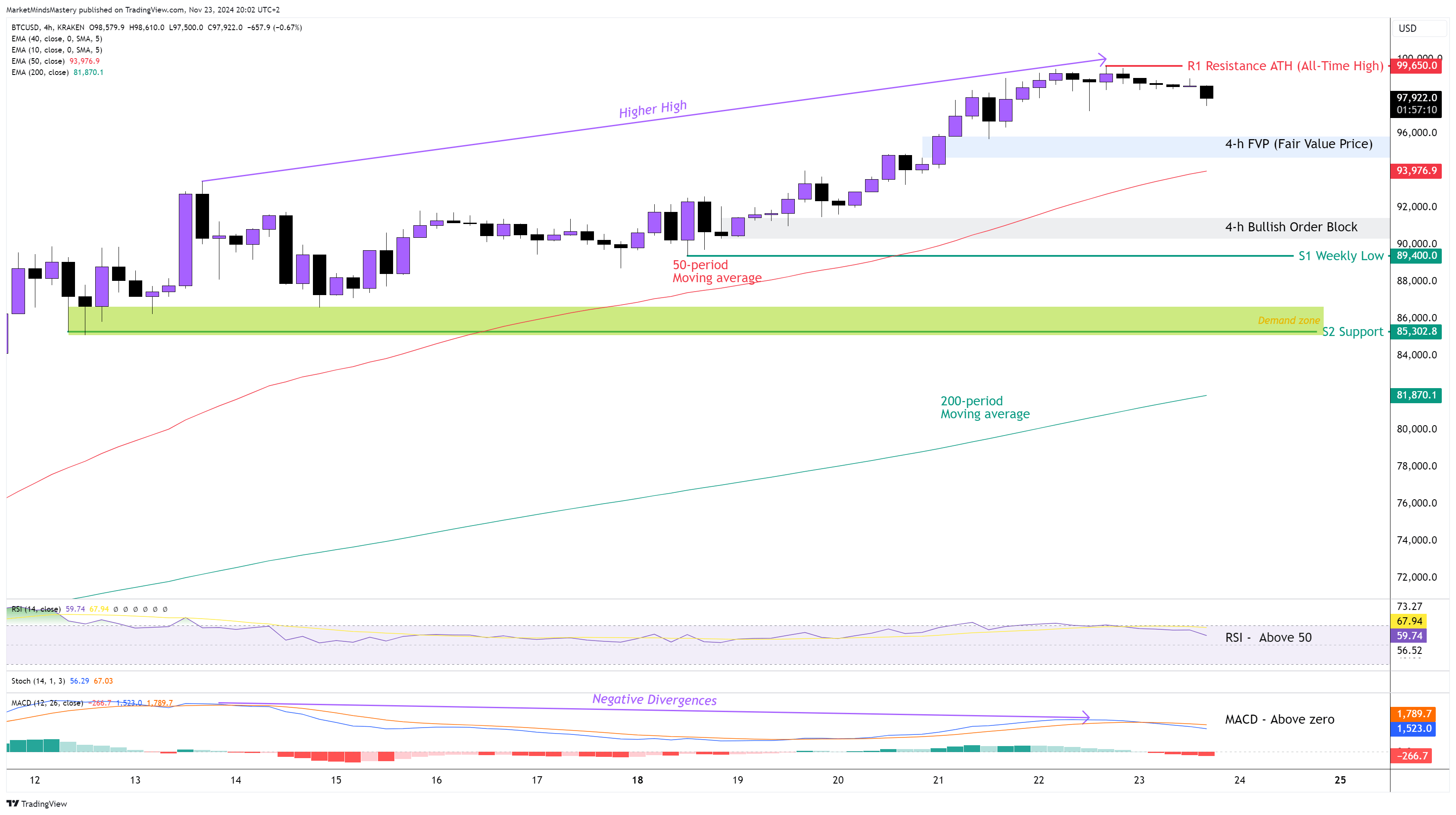 Bitcoin’s Bullishness continued with another strong week, and the price reached a new ATH (All-time High) at $99650. This is the ATH at the time we created this analysis. The weekly candle ended as a Bullish Marubozu. On the 4-hour chart, the price created a new higher high but without momentum, as shown by the MACD indicator, as the MACD Line (Blue) created a lower low formation, known as Negative (or Bearish) Divergences A’ Class. This can set the price in a retracement phase. The 50-period is above the 200-period moving average, and this is Bullish. The RSI Oscillator is above its middle line of 50, and this is bullish. Last Tuesday, the BTCUSD created a Bullish Order Block of around $91000 and two days later, on Thursday, an FVP (Fair Value Price) of around $95000. Starting Monday, if the price enteres a retracement phase, it means it will start moving downwards. In this case, the FVP and the Order Block can be used as support areas. If the price won’t bounce off from these two and instead it keeps moving downwards, the first support area, S1, will be around $89400, which is the previous week’s low. If the price penetrates the S1 and keeps lowering, the next support area, S2, will be around $85300.