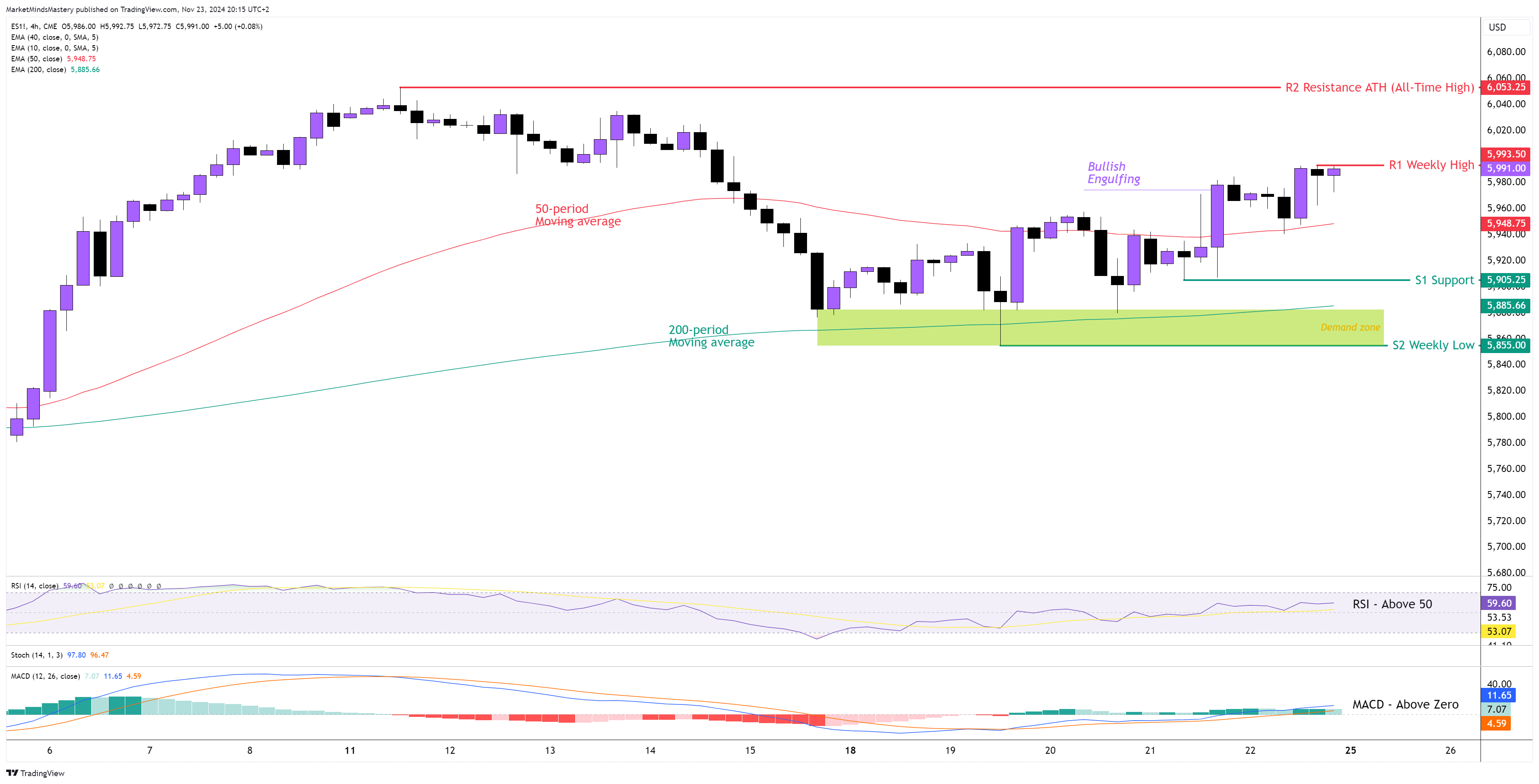 Following the previous week’s Market Outlook, the weekly chart maintained its primary trend. Also, the weekly price action ended as a Bullish Continuation candle, indicating the Buying pressure in the market after a shallow retracement. On the 4-hour chart, the price last Tuesday bounced off the FVP (Fair Value Price) we pointed out on the previous week’s Market Outlook and the 200-period moving average, and it moved upwards in a series of higher highs and higher lows. The 50-period is above the 200-period moving average, and this is bullish. The RSI is above its middle line of 50, and this has bullish implications. The MACD is now above its zero line and also has bullish implications. Currently, the price is above the 50-period moving average. Therefore, if it continues moving upwards, the first resistance area, R1, will be at $5993.50, which is the previous week’s high. If the price penetrates the R1 and keeps increasing, the next resistance area, R2, will be the ATH (All-time High) at $6053.25. On the contrary, if the price is rejected and moves downwards, the first support area, S1, will be at $54905.25. If the price doesn't bounce off, and instead of declining and moving downwards, the next support area, S2, will be at $5855, which is the previous week’s low.