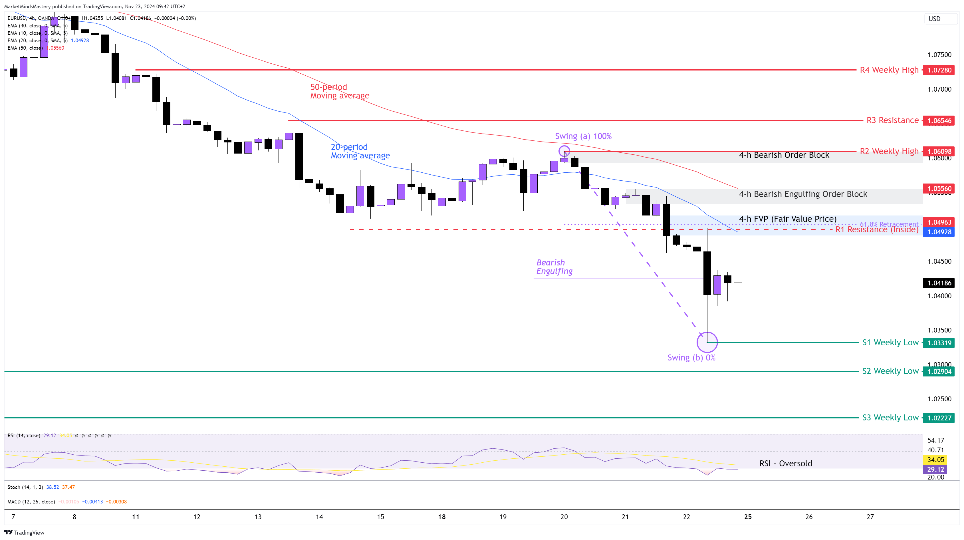 On the other hand, if the price bounces off and moves upwards, it will start a retracement phase. In this case, the First Resistance area R1 will be an Inside Resistance around 1.04963. This level is considered a significant level of resistance because it coincides with the 4-hour FVP (Fair Value Price) created last Thursday, the 20-period moving average and the 61.8% Golden Ratio Fibonacci. If the price penetrates R1 and keeps increasing, the next area of resistance, R2, will be around 1.06098, which is the previous week’s high. This is also considered a key level of resistance because it consists of the Bearish Engulfing Order Block created last Wednesday and also the 50-period moving average. If the price penetrates the R2 and keeps moving upward to the next resistance area, R3 will be around 1.06546.