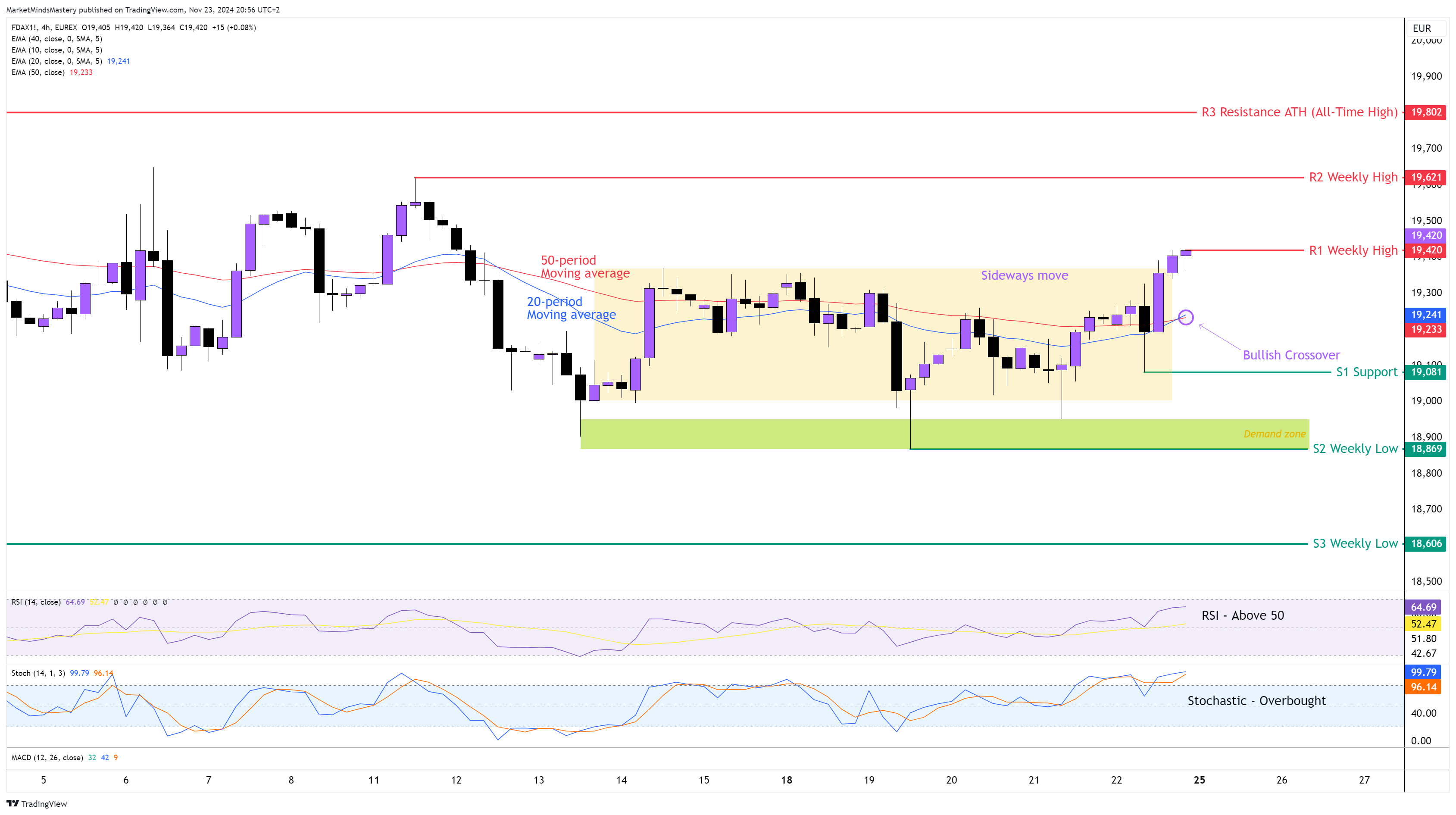 The weekly price action ended as a Bullish Hammer with a Long Lower Wick. This is a strong indication that the buy orders may force the market to keep moving upward next week. The primary trend on the weekly chart is an uptrend, but the candlestick, even though it has a bullish implication, still makes a lower high and lower low. On the 4-hour chart, until last Friday, the price was trading within a sideway move, between the range of 19000 to 19400. Last Friday, the price created a higher high formation and is expected to begin a new upward move. The 20-period moving average crossed above the 50-period moving average, and this is bullish. The RSI Oscillator is above its middle line of 50, and this is also bullish. The Stochastic Oscillator has an Overbought condition, indicating a high price upward move. Starting Monday, if the price continues to move upwards, the first residence area, R1, will be at 19420, which is the previous week’s high. If the price penetrates the R1 and keeps increasing, the next resistance area, R2, will be the 19621. If the price surpasses R2 and keeps increasing, the next resistance area, R3, will be the ATH (All-time High) at 19802. Oppositely, if the price is rejected and moves downwards, the first support area, S1, will be at 19081. If the price penetrates the S1 and keeps moving downwards, the next support area, S2, will be at 18869, which is the previous week’s low.