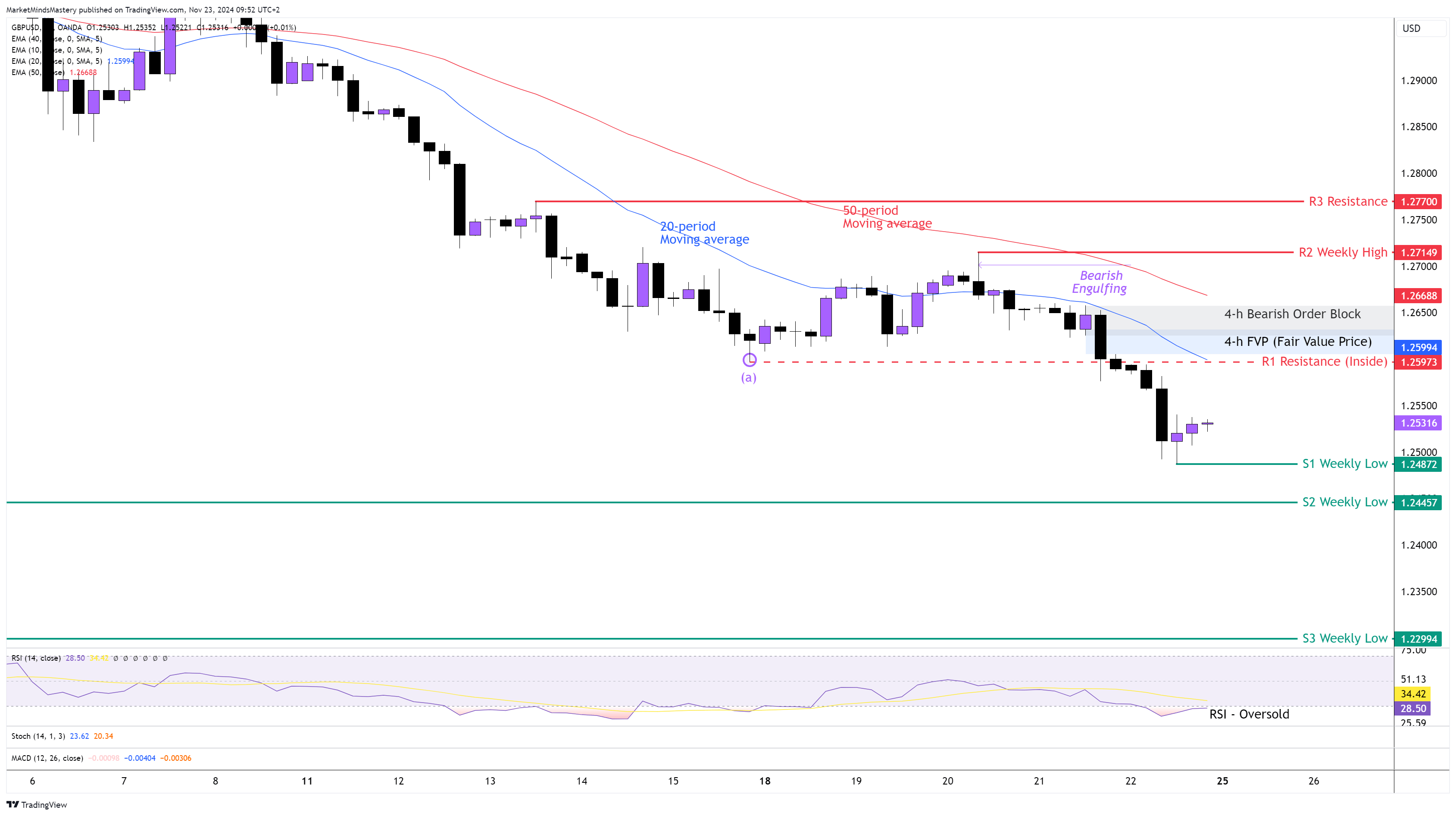 The previous week’s price action ended as another Bearish candlestick. But that time, the weekly candlestick had a noticeable Upper Wick. On the 4-hour chart, the downtrend continued as the price last Wednesday printed a Bearish Engulfing candlestick, rejecting the 20-period moving average. The 20-period is below the 50-period moving average, which is bearish. The RSI Oscillator is in an Oversold condition, which indicates the price’s strong bearish pressure. Last Thursday, the price penetrated the swing low at point (a), creating a Bearish Order Block around 1.26500 and an FVP (Fair Value Price) around 1.25994. Starting Monday, if the price continues to move downwards, the first support area, S1, will be around 1.24872, which is the previous week’s low. If the price penetrates the S1 and keeps lowering, the next support areas, S2 and S3, will be at 1.24457 and 1.22994, respectively. If the price starts a retracement phase, meaning it will move upwards, the first resistance area, R1, will be an Inside Resistance around 1.25973. If the price penetrates the R1 and keeps increasing, the next resistance area, R2, will be the previous week’s high at 1.27149.