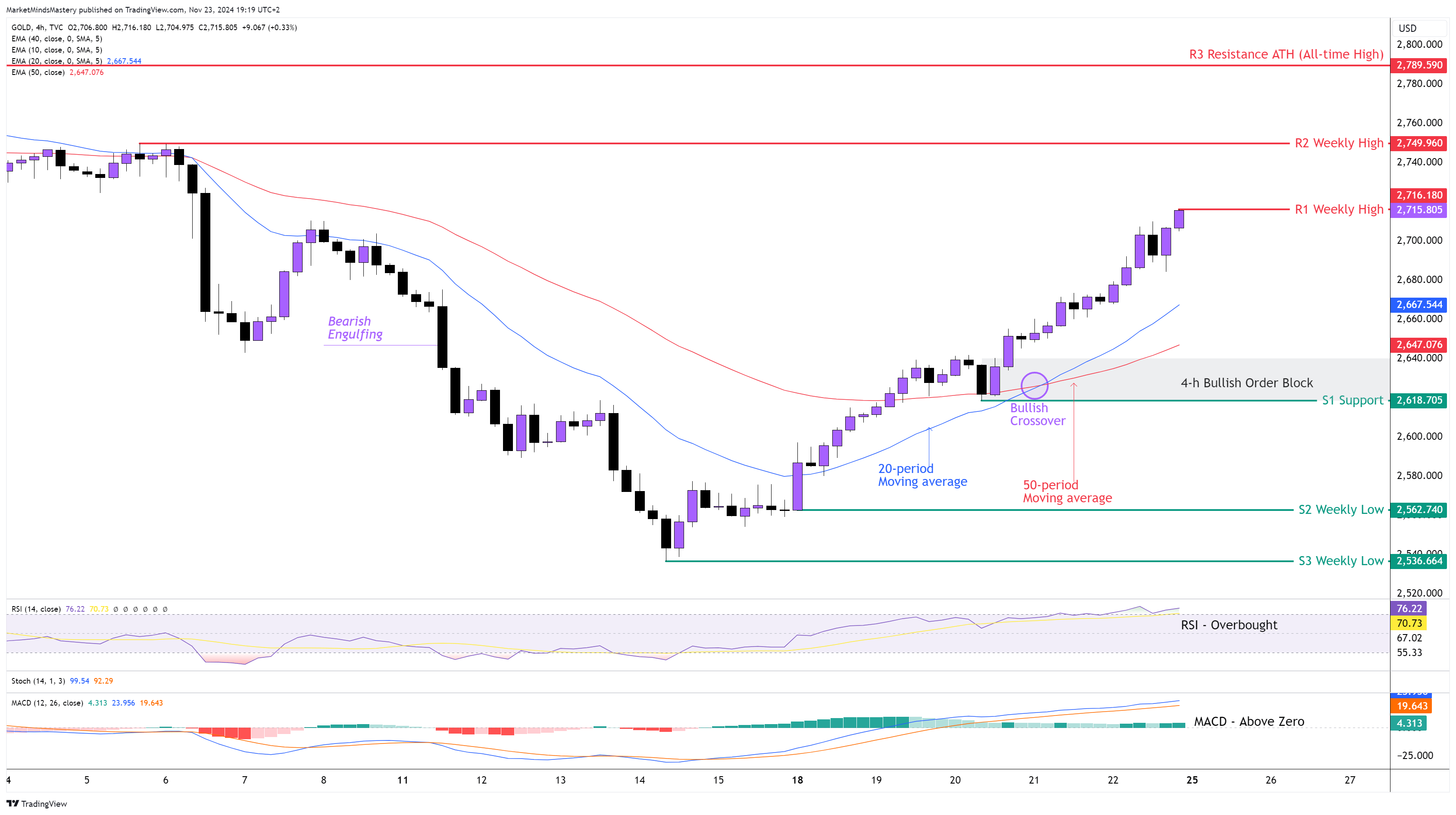 Additionally, the MACD is above its zero line, and its Histogram is rising, indicating bullishness. If the price continues moving upwards, the first resistance area, R1, will be at $2716, the previous week’s high. If the price penetrates the R1 and keeps increasing, the next resistance area, R2, will be around $2749. On the other hand, if the price is rejected and moves downwards, the first support area, S1, will be at $2618. This is a key level of support as it consists of the Bullish Order Block created last Wednesday during the New York trading session and the 50-period moving average. If the price, instead of bouncing off the S1, penetrates it and declines further, it can move downwards until the next support area, S2, around $2562, which is the previous week’s low.