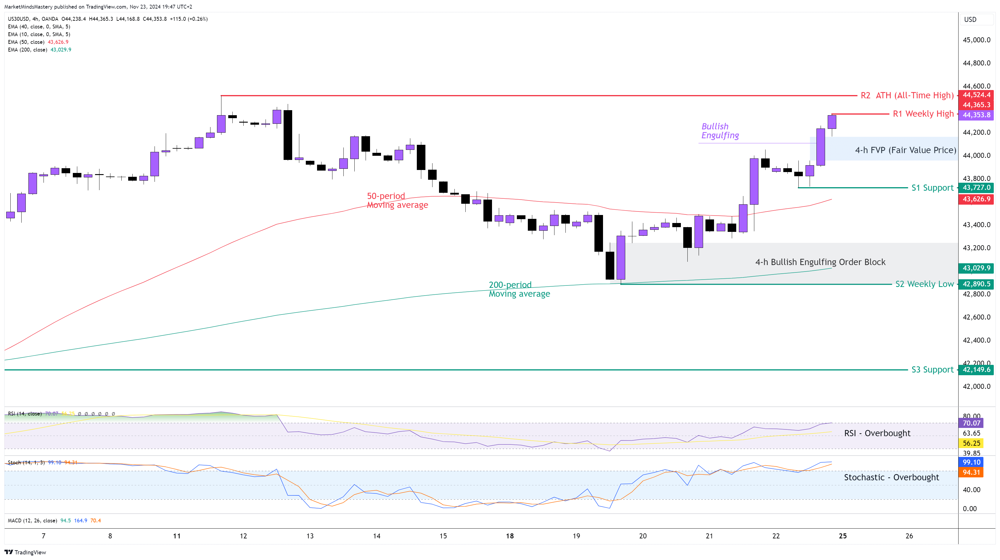 The US indices rallied last week, and the US30 was the strongest out of the three major US indices. The reason is that Bullish Engulfing is created on the weekly chart. On the 4-hour chart, the price last Tuesday bounced off the 200-period moving average, it created a Bullish Engulfing Order Block around $43000, and then it moved upwards. Last Friday, the price created a noticeable FVP (Fair Value Price) of around $44100 towards the end of New York’s trading session. The 50-period is above the 200-period moving average, and this is bullish. Both the RSI and the Stochastic Oscillators are in their Overbought condition, indicating bullishness. Therefore, if the price continues moving upwards, the first resistance area, R1, will be around $$44365, which is the previous week’s high. If the price penetrates the R1 and keeps increasing, the next resistance area, R2, will be the ATH (All-time High) around $44524. Oppositely, if the price is rejected and moves downwards, the first support area, S1, will be approximately $43727. If the price penetrates the S1 and keeps lowering, the next support area, S2, will be at $42890, which is the previous week’s low. This is considered a key level of support as it coexists with the 200-period moving average and the Bullish Order Block.