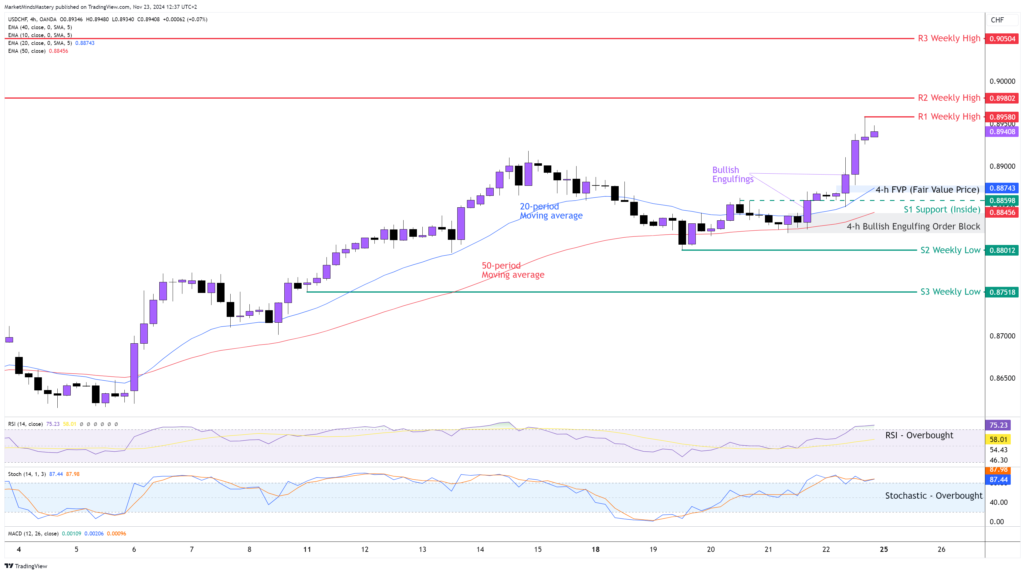 The Swiss Frank's weakness was evident during the week, and the price of the USDCHF, for the sixth week in a row, ended as a Bullish Continuation candle. On the 4-hour chart, the price bounced the Bullish Order Block last Tuesday and then moved upwards, creating a higher high formation. This created a new market structure on the price chart with a Bullish Engulfing Order Block around 0.88300 and an FVP (Fair Value Price) around 0.88700. As the price keeps making higher highs without forming any swing high, we cannot use the Fibonacci retracement tool to estimate the retracement levels. However, the RSI and the Stochastic Oscillators both became Overbought, indicating a strong bullish market. Hence, if the price continues moving upwards, the first resistance area, R1, will be around 0.89580, which is the previous week’s high. If the price penetrates the R1 and keeps increasing, the next resistance area, R2, will be around 0.89802. Oppositely, if the price moves downwards, the first support area, S1, will be an Inside Support around 0.88598. This is considered a key level of support as it consists of the levels between the 20 and the 50-period moving averages, the FVP. It is also above the Bullish Order Block. If the price penetrates the S1 and moves downwards, the next support area, S2, will be around 0.88012, which is an older weekly level. A Further downward move finds the next support area, S3, at approximately 0.87518.