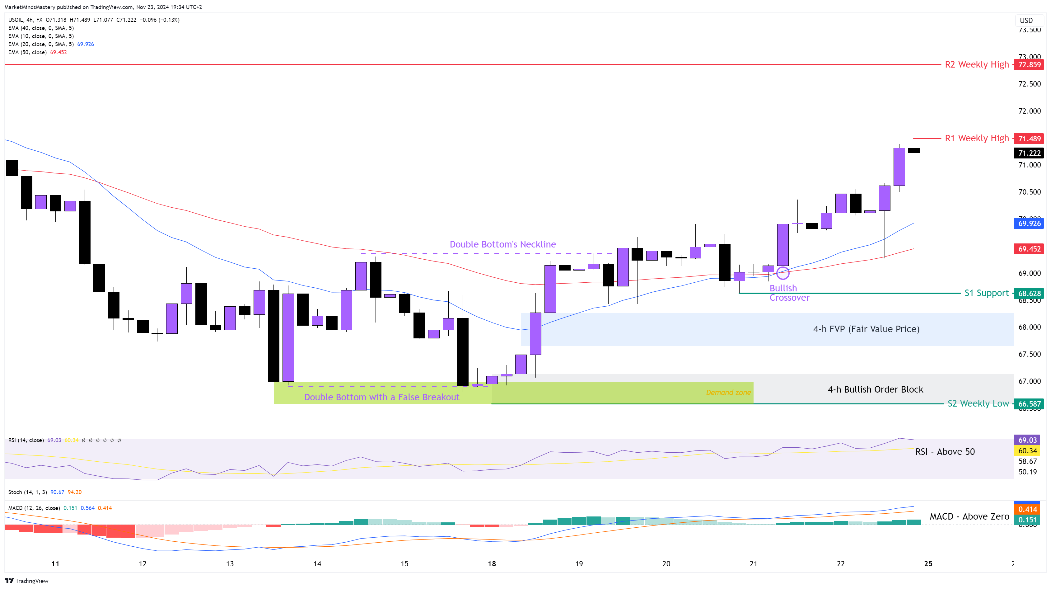 The weekly candlestick of the USOIL market ended as a Bullish Engulfing, and the candle closed above the previous week’s candle high, which is a sign of market strength. This shows that the buying pressure is very strong, and based on that, the next week, the price is expected to continue moving upwards. Moving down into the 4-hour chart, the price created a False Breakout last Monday, formed a Double Bottom Reversal pattern and then the price moved upwards in a series of higher highs and higher lows—a Demand Zone formed around $66.50. Additionally, in the same area, the price created a Bullish Order Block. On the same day, the price created an FVP (Fair Value Price) around $68.00. Last Thursday, the 20-period crossed above the 50-period moving average, which is known as a Bullish Crossover. The RSI is above 50, and this has bullish implications. The MACD is above its zero line, and this is bullish. Starting Monday, if the price keeps moving upwards, the first resistance area, R1, will be around $71.48, which is the previous week’s high. If the price penetrates the R1 and keeps increasing, the next resistance area, R2, will be around $72.85. If the price is rejected and starts moving downwards, the first support area, S1, will be at $68.62. If the price penetrates the S1 and keeps moving downwards, the next support area, S2, will be around $66.58, which is the previous week’s low.
