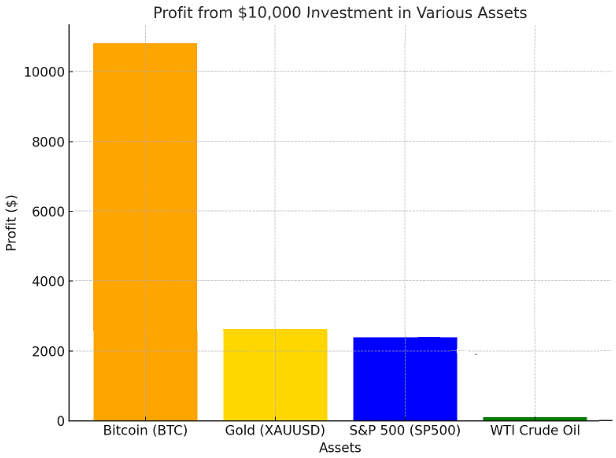 If you had invested $10,000 across these assets one year ago, Bitcoin would have been the best performer, delivering over $10,800 in profit.