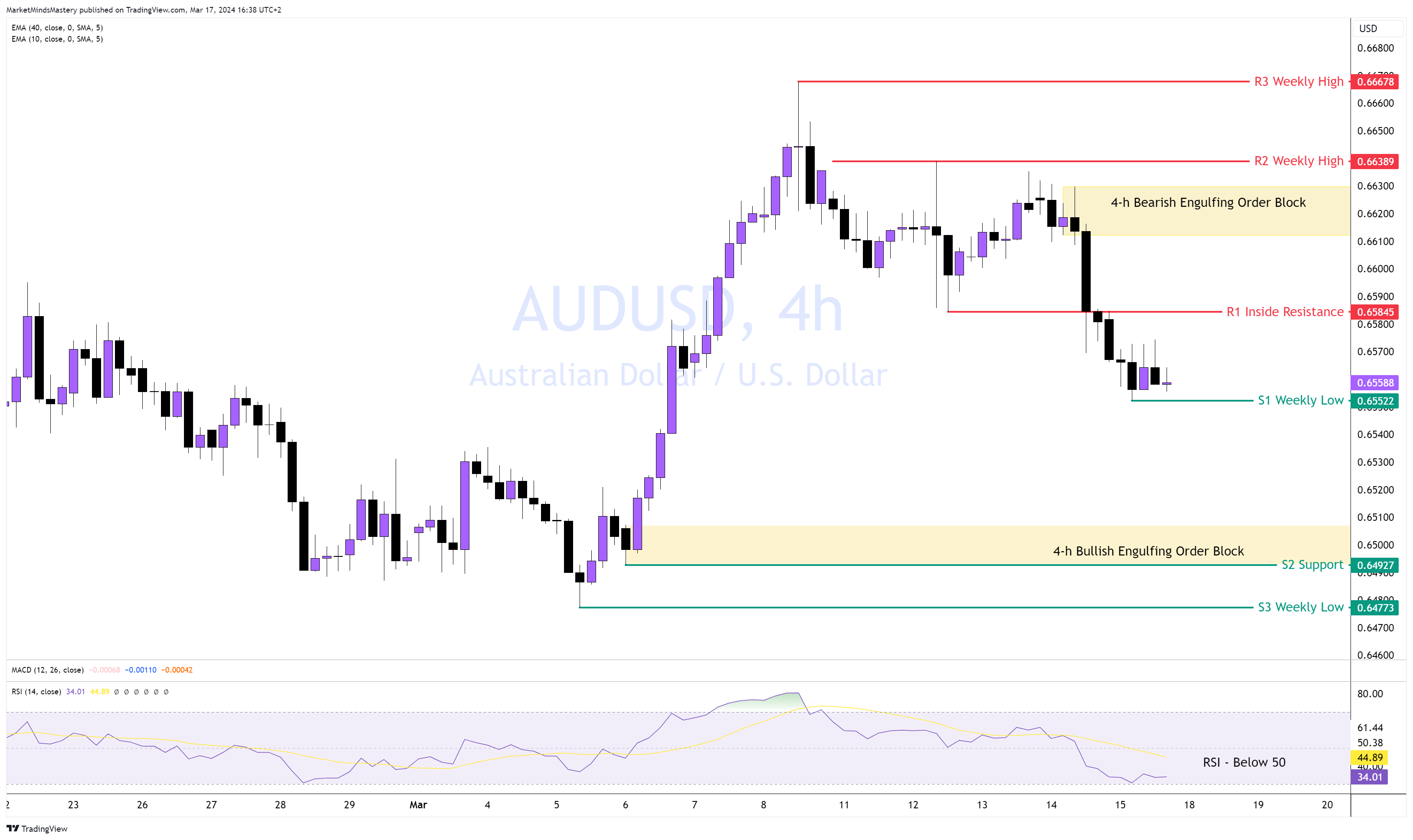 Auf diesem Kursniveau wurde ein Bullish Engulfing Order Block gebildet, der eine Marktreaktion auslösen kann. Wenn der Kurs den Aufwärtstrend auf der Tagesbasis beibehält, dann wird dieser Kursbereich wahrscheinlich zu einem hochwahrscheinlichen Wendepunkt für die Wiederaufnahme des Aufwärtstrends auf der Tagesbasis. Wenn der Kurs also von diesem Niveau abprallt und sich nach oben bewegt, kann er auf den ersten Widerstand R1 treffen, einen Innenwiderstand von etwa 0,65845. Bei einer Bewegung darüber hinaus liegt der nächste Widerstand, R2, beim Höchststand der Vorwoche, etwa bei 0,66389.