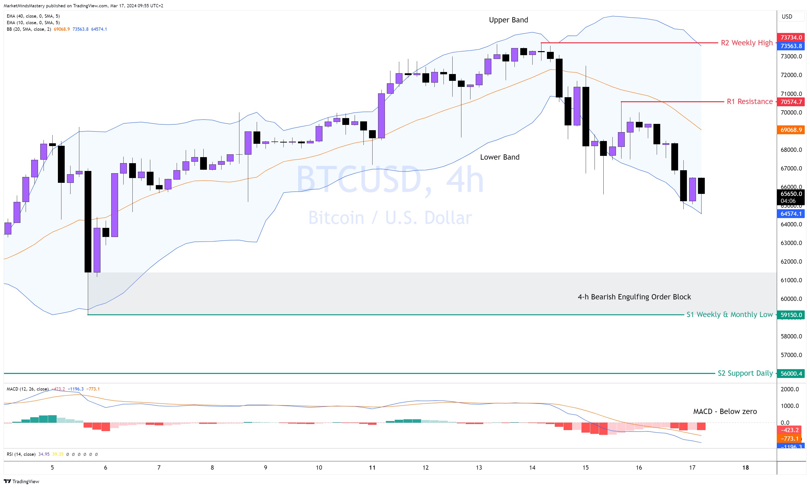 Umgekehrt, wenn der Kurs zinsbullischen Druck erfährt und ansteigt, liegt der erste Widerstand, R1, bei etwa 70574 $. Eine weitere Rallye wird den R2-Widerstand bei seinem All-Time-High von etwa $73700 treffen.