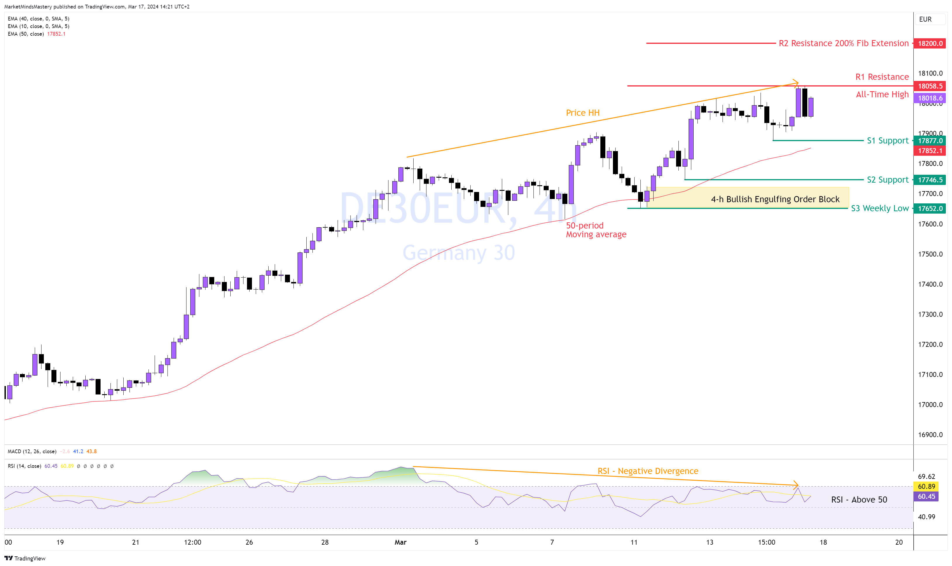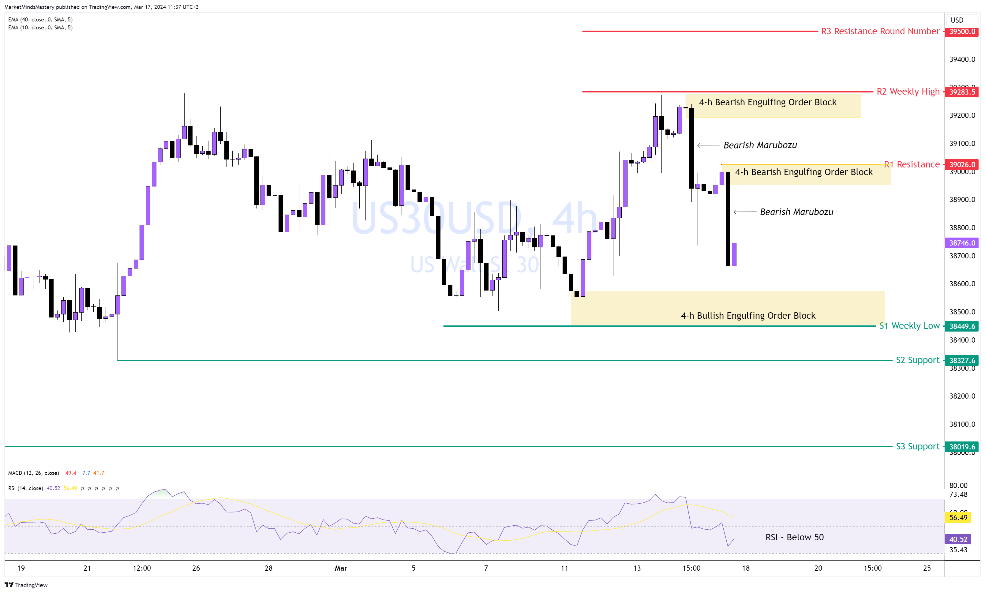 Nach einem erneuten Test des All-Time-Hochs in der vergangenen Woche bei 39280 fiel der Kurs mit einigen auffälligen langen bärischen Marubozu-Kerzen - beide Kerzen entstanden durch Order-Blöcke, wie auf dem Chart zu sehen ist. Der RSI liegt unter 50, was auf Verkaufsdruck im 4-Stunden-Zeitfenster hindeutet. Auf dem Tages-Chart hat sich eine equal top Kursformation gebildet, die von negativen RSI-Divergenzen begleitet wird, die bärische Implikationen haben.
