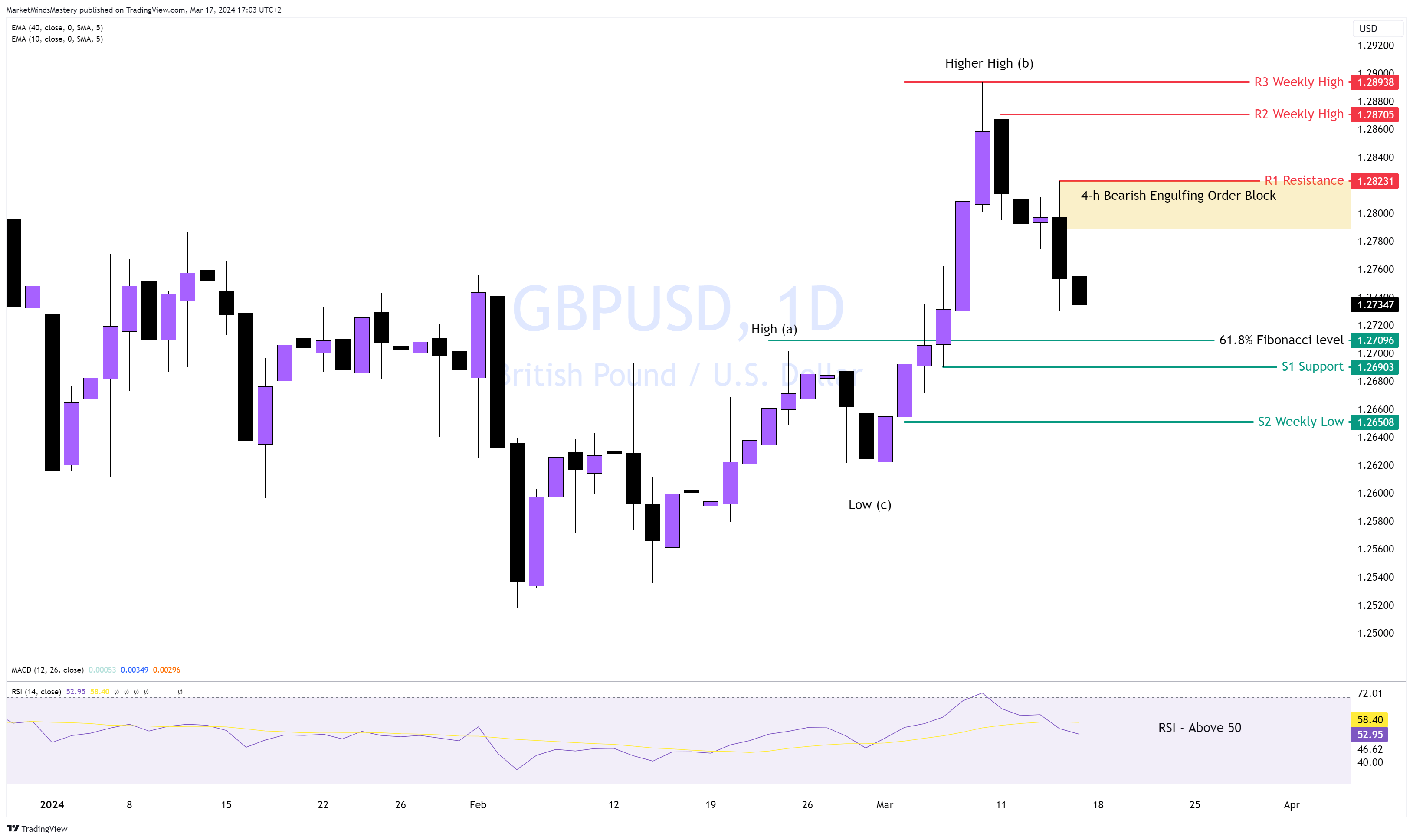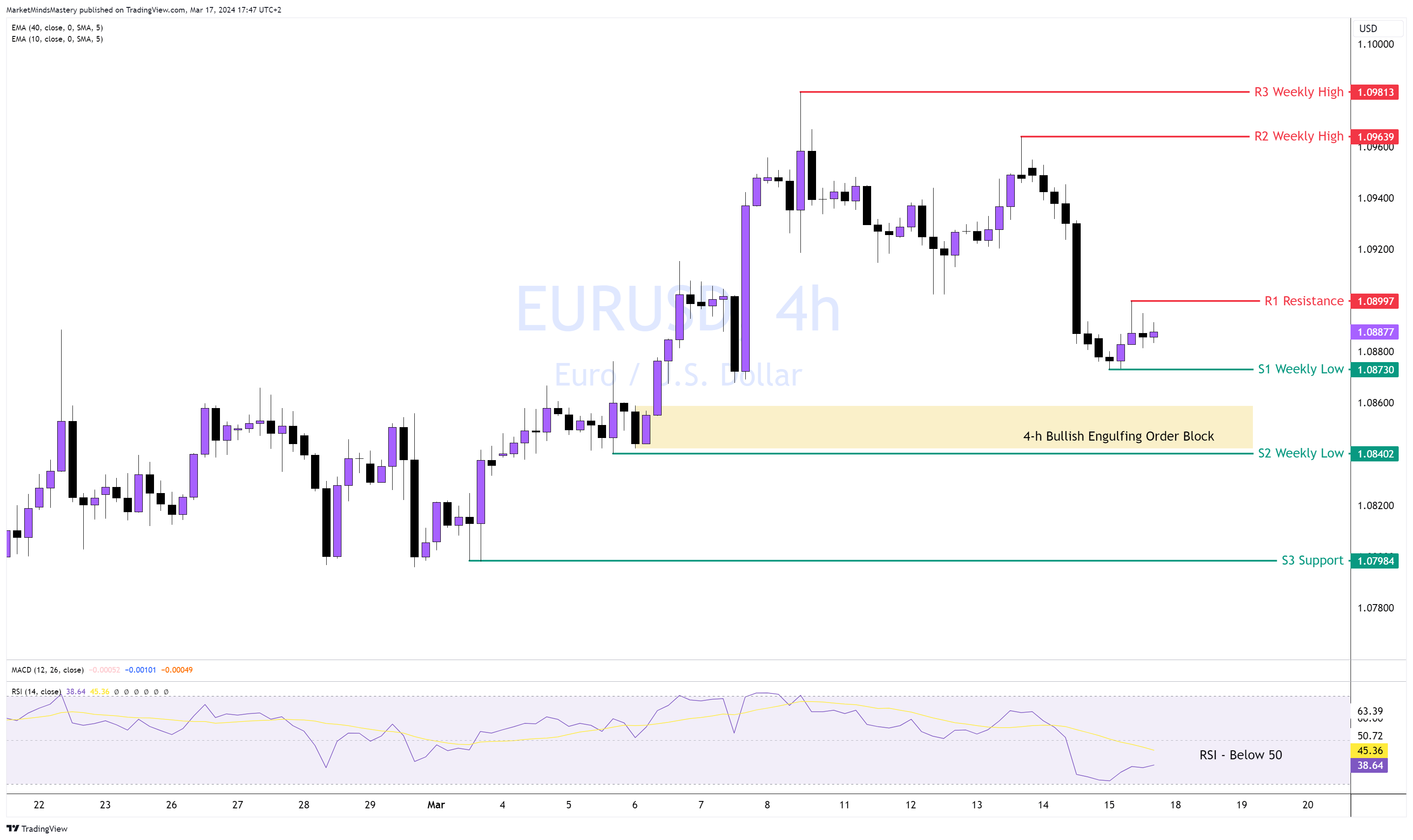 Gemäß unserer Analyse der letzten Woche ist der Kurs in den 4-Stunden-Bullish Engulfing Order Block eingetreten, prallte ab und bewegte sich nach oben, wodurch der R1-Widerstand um 1,08997 entstand. Während der Kurs auf der 4-Stunden-Chart sinkt, liegt der RSI unter 50, was auf eine rückläufige Marktentwicklung hinweist. Sollte der Kurs weiter abwärts tendieren, wird das S1-Wochentief bei etwa 1,08730 die erste Unterstützung sein. Wenn der Kurs weiter fällt und die S1-Marke durchbricht, ist die nächste Unterstützung, S2, ein weiteres Wochentief bei etwa 1,08402. Auf diesem Niveau identifizieren wir einen 4-h Bullish Engulfing Order Block.