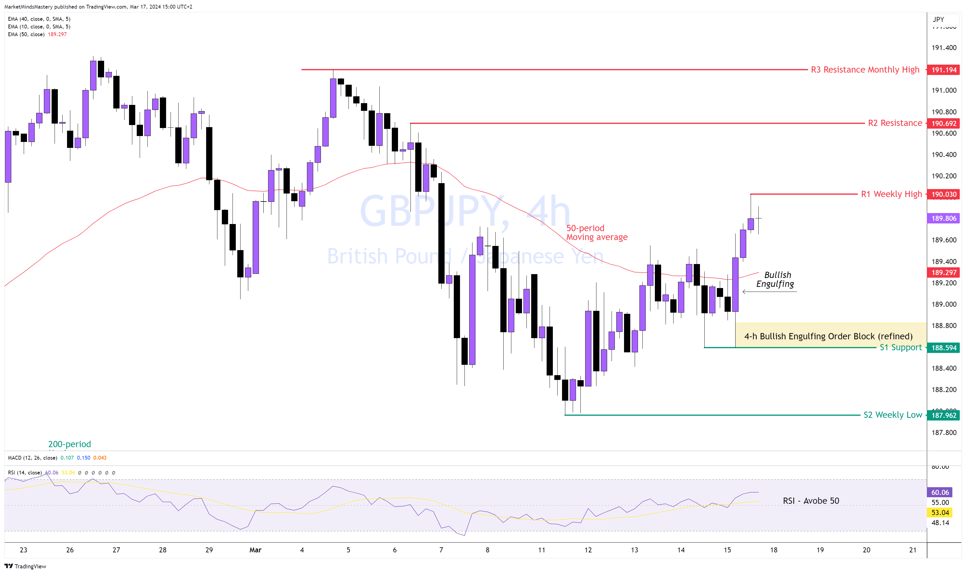 Fällt der Kurs hingegen und bewegt sich abwärts, ist der erste Unterstützungsbereich, S1, der Tiefpunkt der Bullish Engulfing-Kerze, die den Aufwärtsimpuls ausgelöst hat, bei etwa 188,594. Auf diesem Kursniveau hat sich ein verfeinertes 4-Stunden-Bullish Engulfing Order Block entwickelt. Bei einem weiteren Rückgang und Unterschreiten von S1 ist der nächste Unterstützungsbereich, S2, bei ca. 187,962 zu finden.