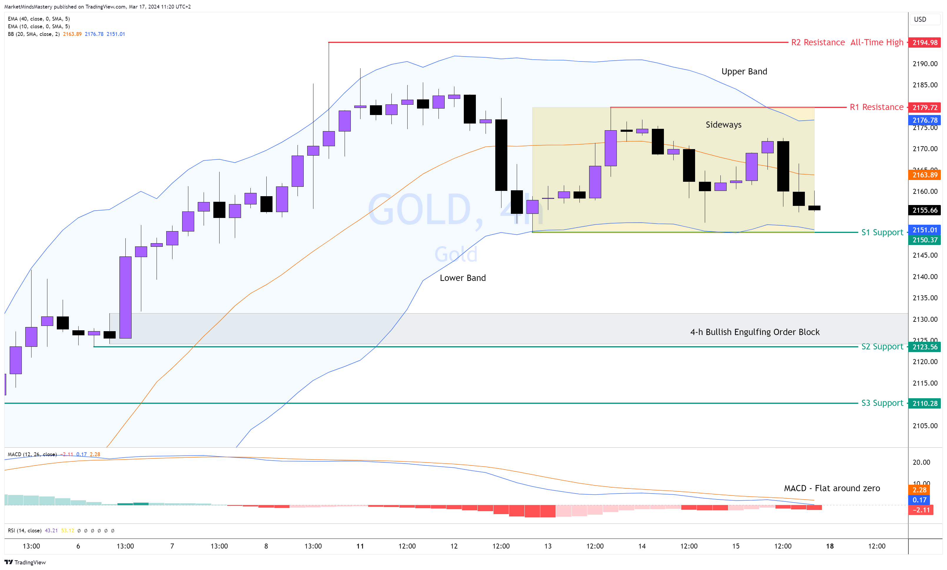 Durchdringt der Kurs hingegen den oberen Teil des Bollinger-Bandes, wird er auf den ersten Widerstand R1 bei etwa 2179 $ treffen. Bewegt sich der Kurs darüber und schließt höher, ist der nächste Widerstandsbereich R2, um $2194, was ein All-Time High ist.