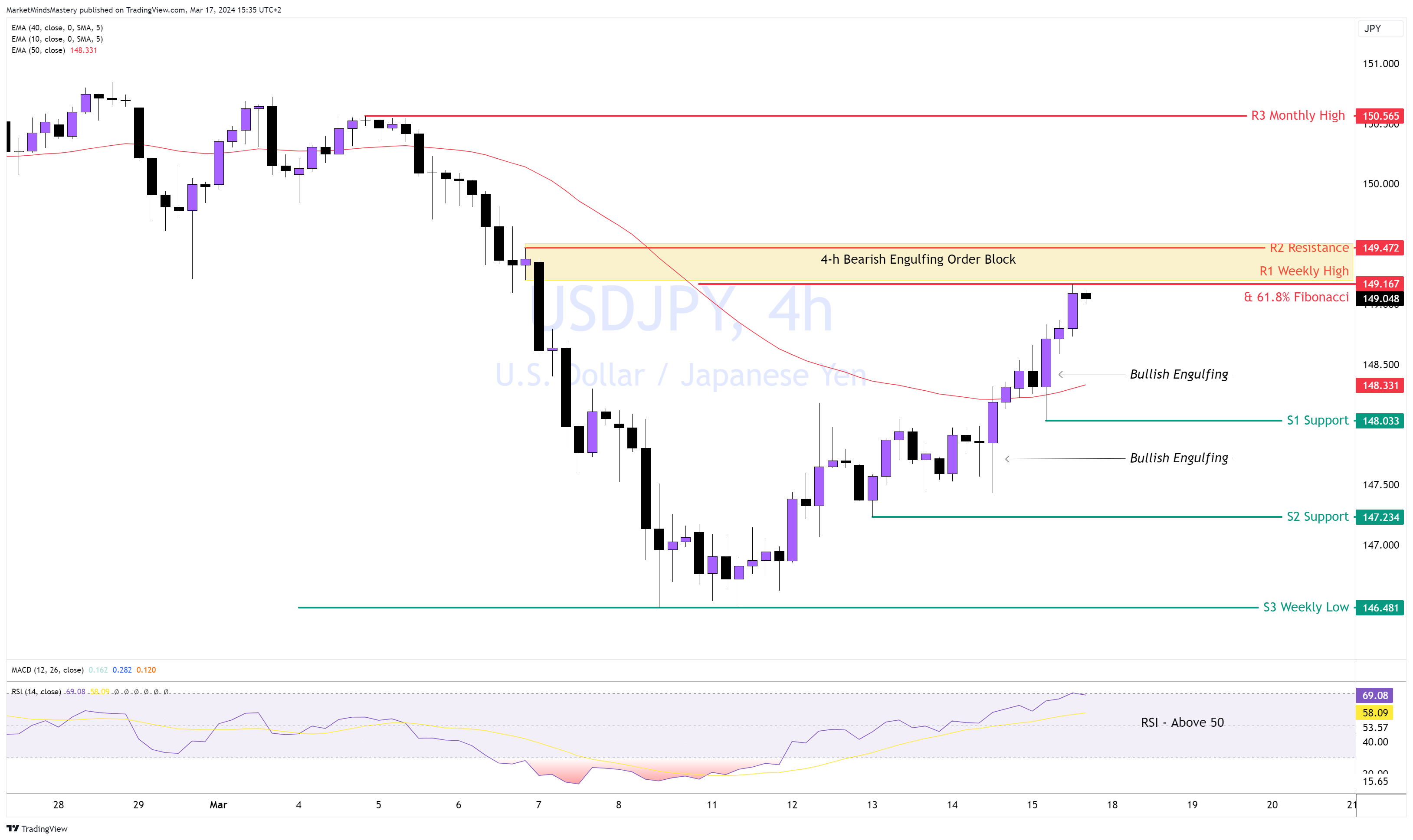 Die beiden Bullish Engulfing-Kerzen deuten auf die Kontrolle der Käufer über den Markt hin. Wenn der Kurs ab Montag in den 4-Stunden-Bearish-Engulfing-Order-Block eintritt, der aus dem Hoch der Vorwoche und dem 61,8% Fibonacci-Retracement besteht, sinkt und sich nach unten bewegt, kann er bis zur S1-Unterstützung, etwa 148, gehen. Fällt der Kurs weiter und sinkt weiter, liegt die nächste Unterstützung, S2, bei 147,234.