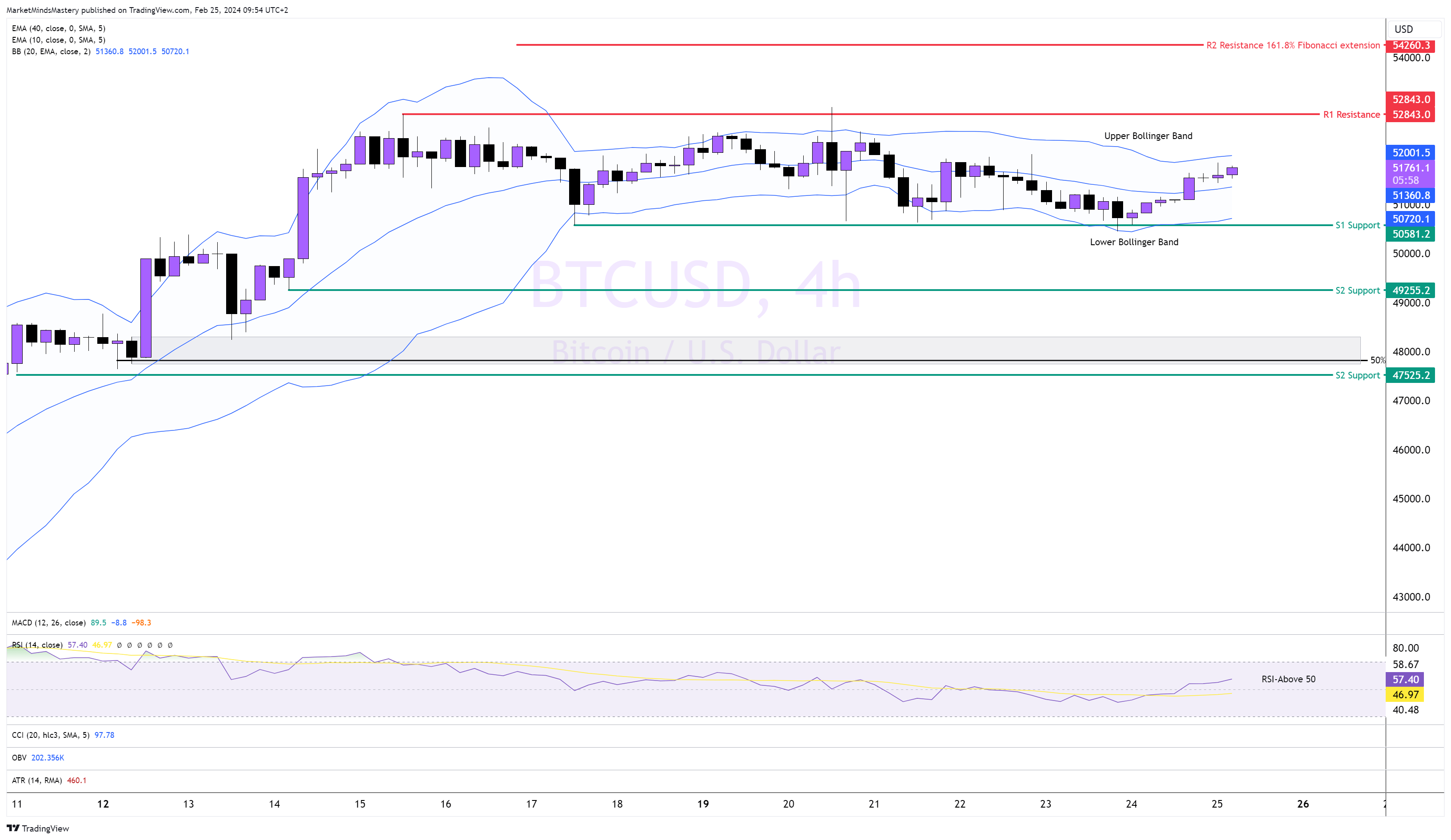 Daher ging der Kurs zurück und testete in der vergangenen Woche mehrmals die S1-Unterstützung um 50581. Gleichzeitig hält das Bollinger Lower Band. Die Unfähigkeit des Preises, oberhalb des oberen Bandes und unterhalb des unteren Bandes zu schließen, deutet auf einen trendlosen Markt hin. Derzeit liegt der RSI über 50, was auf einen Aufwärtstrend hindeutet. Wenn sich der Preis nach oben bewegt, ist der gleiche R1-Widerstand um 52843 der erste Widerstand im Markt.
