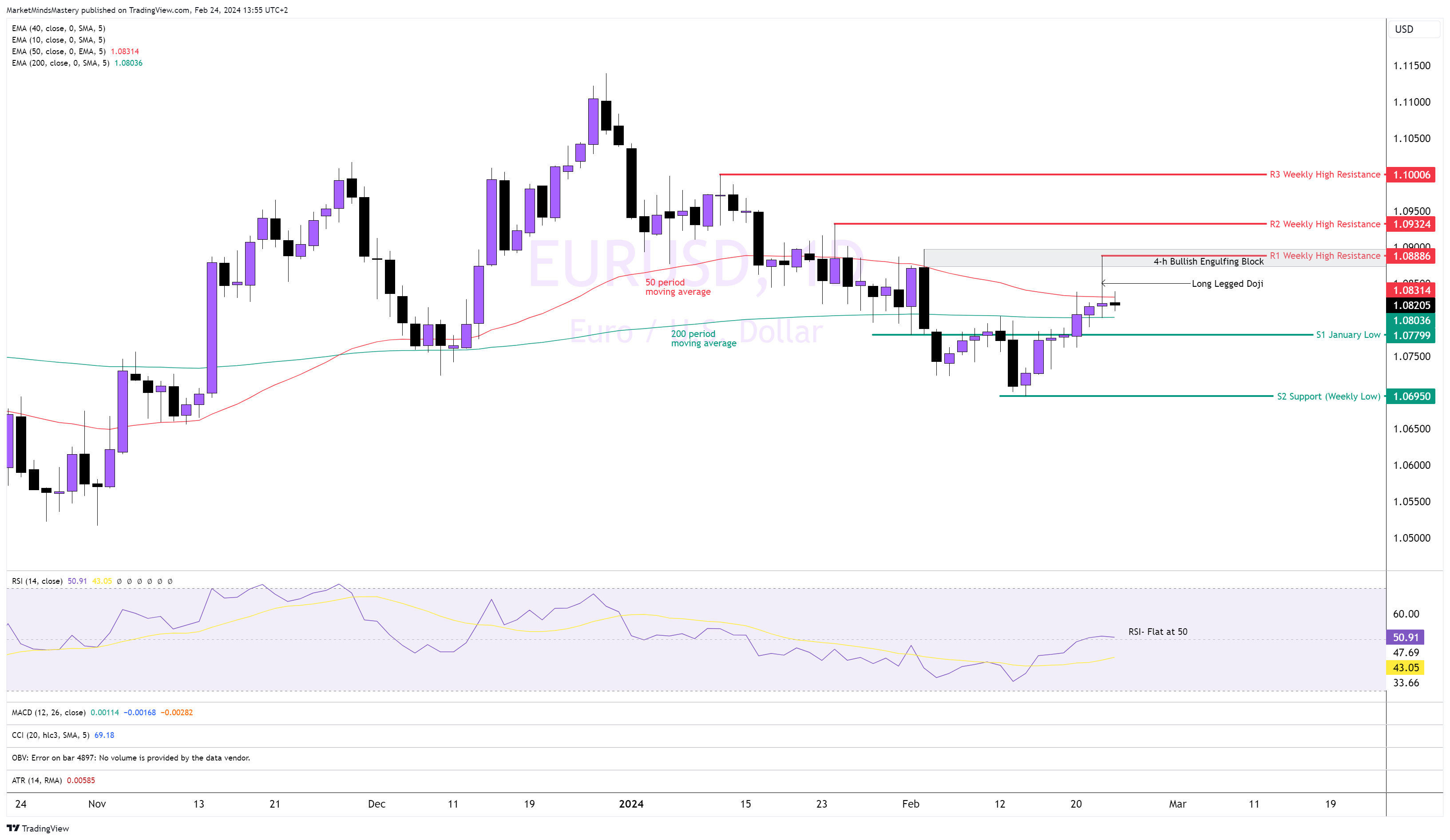 In der vergangenen Woche wurde der Kurs bei einem Versuch, das Kursniveau von 1,09 zu überschreiten, vom 4-h bearish engulfing block zurückgewiesen, und zum Ende der Woche wurde er auch vom gleitenden 50-Perioden-Durchschnitt zurückgewiesen und hinterließ einen langen Docht - derzeit befindet sich der Kurs zwischen dem 50- und dem 200-Perioden-Durchschnitt. Ausgehend von den gleitenden Durchschnitten ist die Tendenz natürlich. Auch der RSI liegt flach bei 50, was bedeutet, dass der Markt richtungslos ist. Wenn sich der Kurs ab Montag nach oben bewegt und das Hoch der letzten Woche durchbricht, wird er den nächsten Widerstand bei 1,09324 finden. Sollte der Kurs hingegen fallen und sich nach unten bewegen, ist der erste Unterstützungsbereich das Tief vom Januar bei 1,0800. Wenn der Preis nicht vom Tief des letzten Monats abprallt und sich darunter bewegt, ist der nächste Unterstützungsbereich, S2, ein Wochentief bei etwa 1,06950.