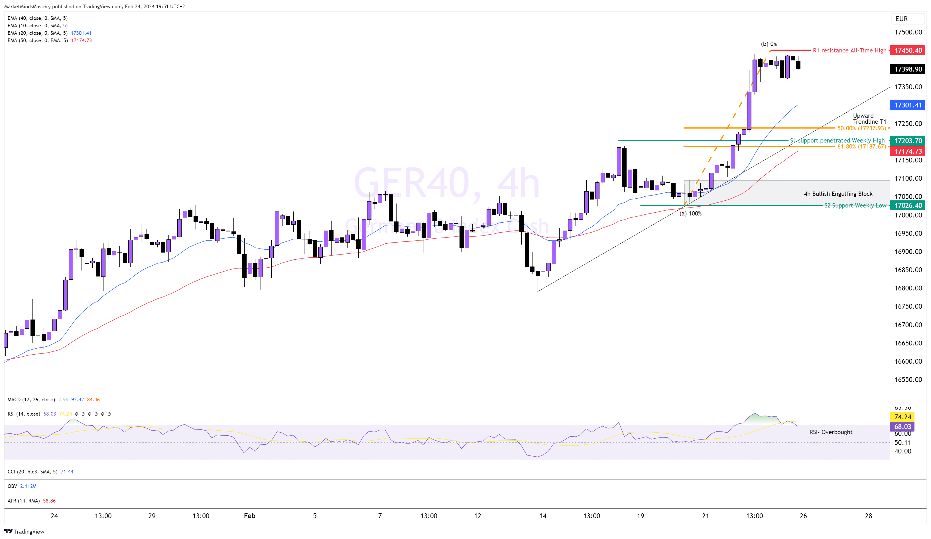 Nach dem Aufwärtsmomentum der letzten Woche hat der Kurs ein neues Allzeithoch bei rund 17.450 erreicht. Der 20er liegt über dem 50er gleitenden Durchschnitt, und die beiden liegen weit auseinander. Auch der RSI ist überkauft, was ein bullisches Zeichen ist. Der Kurs liegt über der Aufwärtstrendlinie T1, was ebenfalls ein bullisches Zeichen ist. Tritt der Kurs also in eine Korrekturphase ein und bewegt sich abwärts, besteht der erste Unterstützungsbereich S1 aus dem durchbrochenen Wochenhoch, das nun als Unterstützung fungieren kann, dem Bereich zwischen dem 50% und 61,8% Fibonacci Retracement, der Aufwärtstrendlinie T1 und dem 50-periodischen gleitenden Durchschnitt.